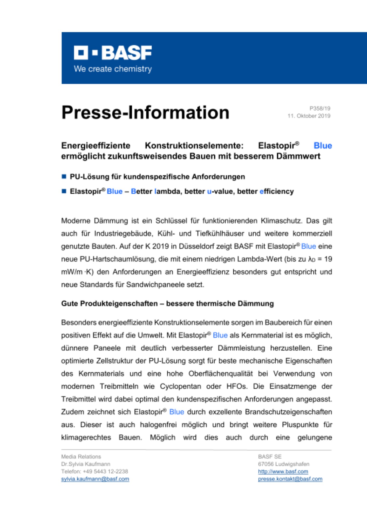 Moderne Dämmung ist ein Schlüssel für funktionierenden Klimaschutz. Das gilt auch für Industriegebäude, Kühl- und Tiefkühlhäuser und weitere kommerziell genutzte Bauten. Auf der K 2019 in Düsseldorf zeigt BASF mit Elastopir® Blue eine neue PU-Hartschaumlösung, die mit einem niedrigen Lambda-Wert (bis zu λD = 19 mW/m ∙K) den Anforderungen an Energieeffizienz besonders gut entspricht und neue Standards für Sandwichpaneele setzt.