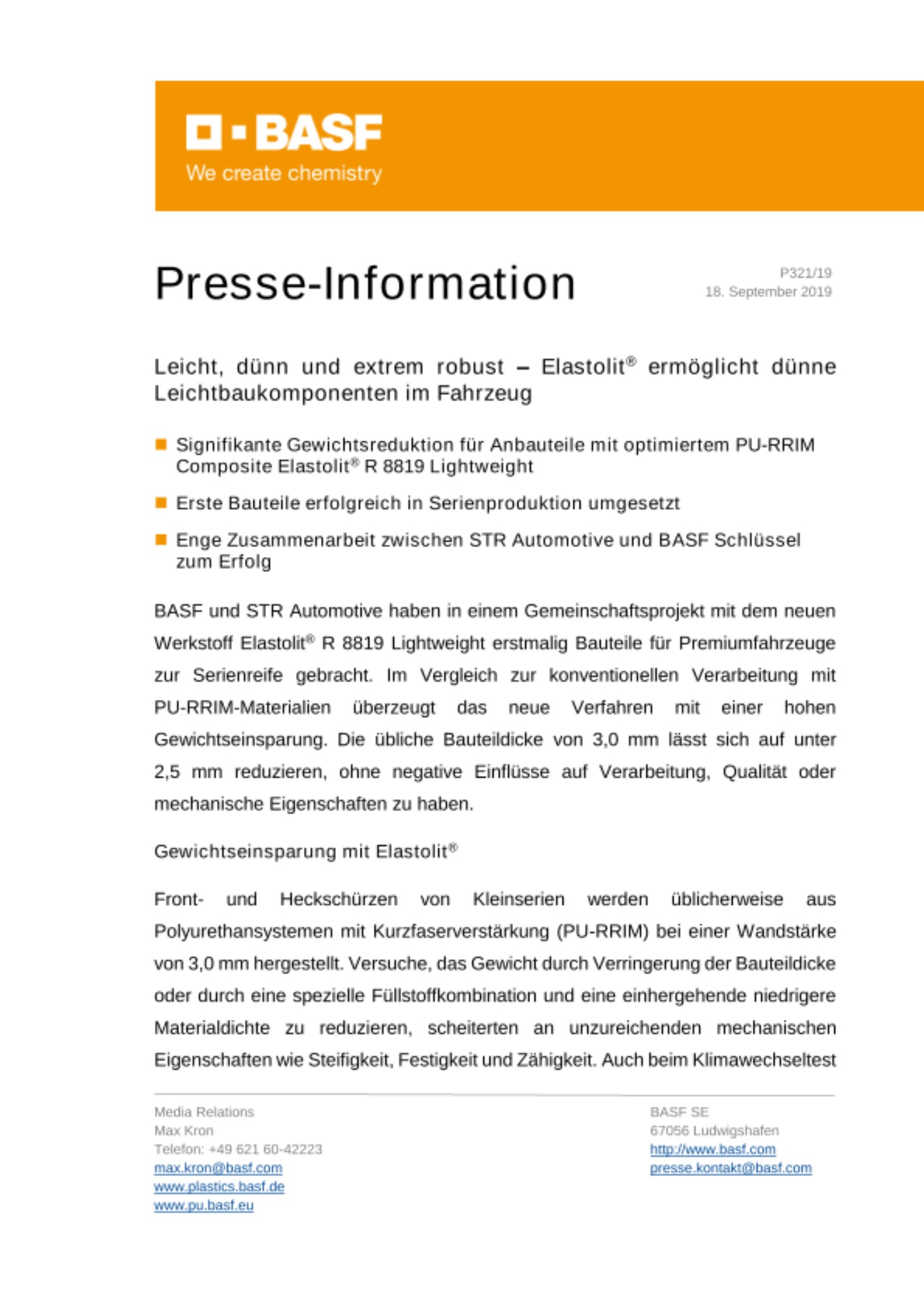 BASF und STR Automotive haben in einem Gemeinschaftsprojekt mit dem neuen Werkstoff Elastolit® R 8819 Lightweight erstmalig Bauteile für Premiumfahrzeuge zur Serienreife gebracht. Im Vergleich zur konventionellen Verarbeitung mit PU-RRIM-Materialien überzeugt das neue Verfahren mit einer hohen Gewichtseinsparung. Die übliche Bauteildicke von 3,0 mm lässt sich auf unter 2,5 mm reduzieren, ohne negative Einflüsse auf Verarbeitung, Qualität oder mechanische Eigenschaften zu haben.