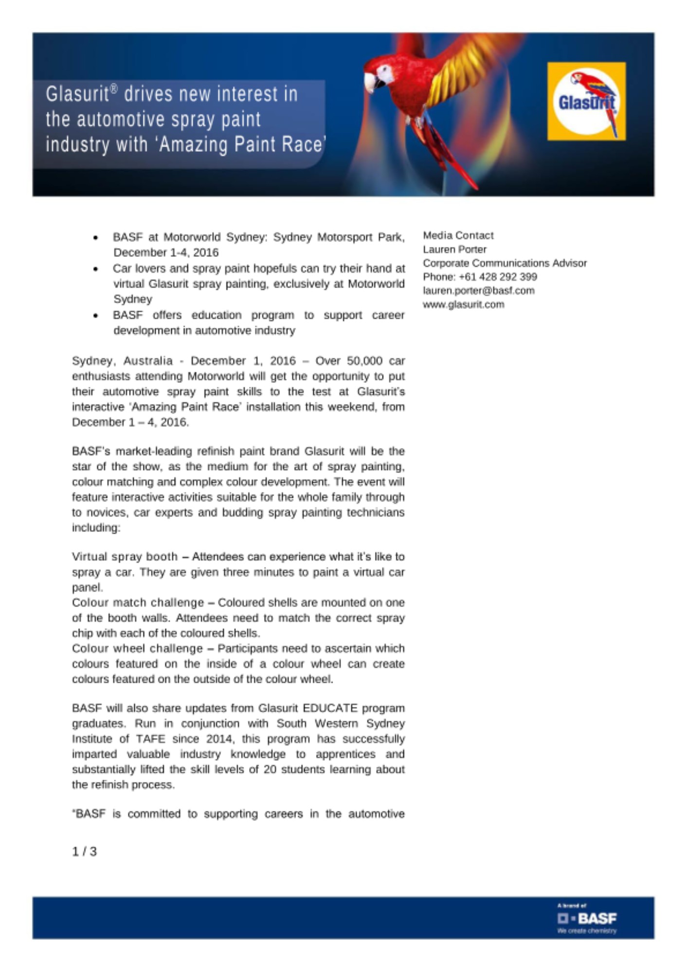 Sydney, Australia - December 1, 2016 – Over 50,000 car enthusiasts attending Motorworld will get the opportunity to put their automotive spray paint skills to the test at Glasurit’s interactive ‘Amazing Paint Race’ installation this weekend, from December 1 – 4, 2016.