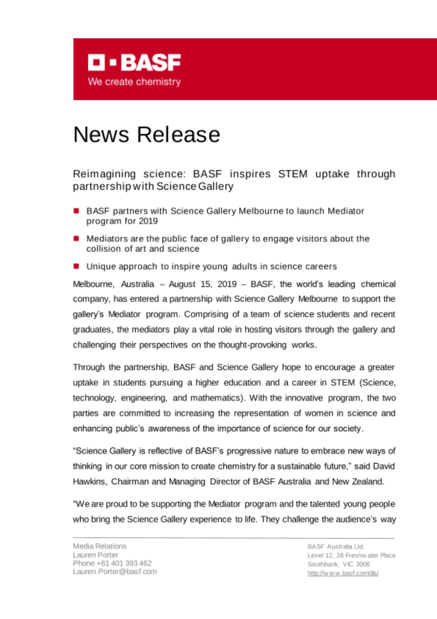 - BASF partners with Science Gallery Melbourne to launch Mediator program for 2019