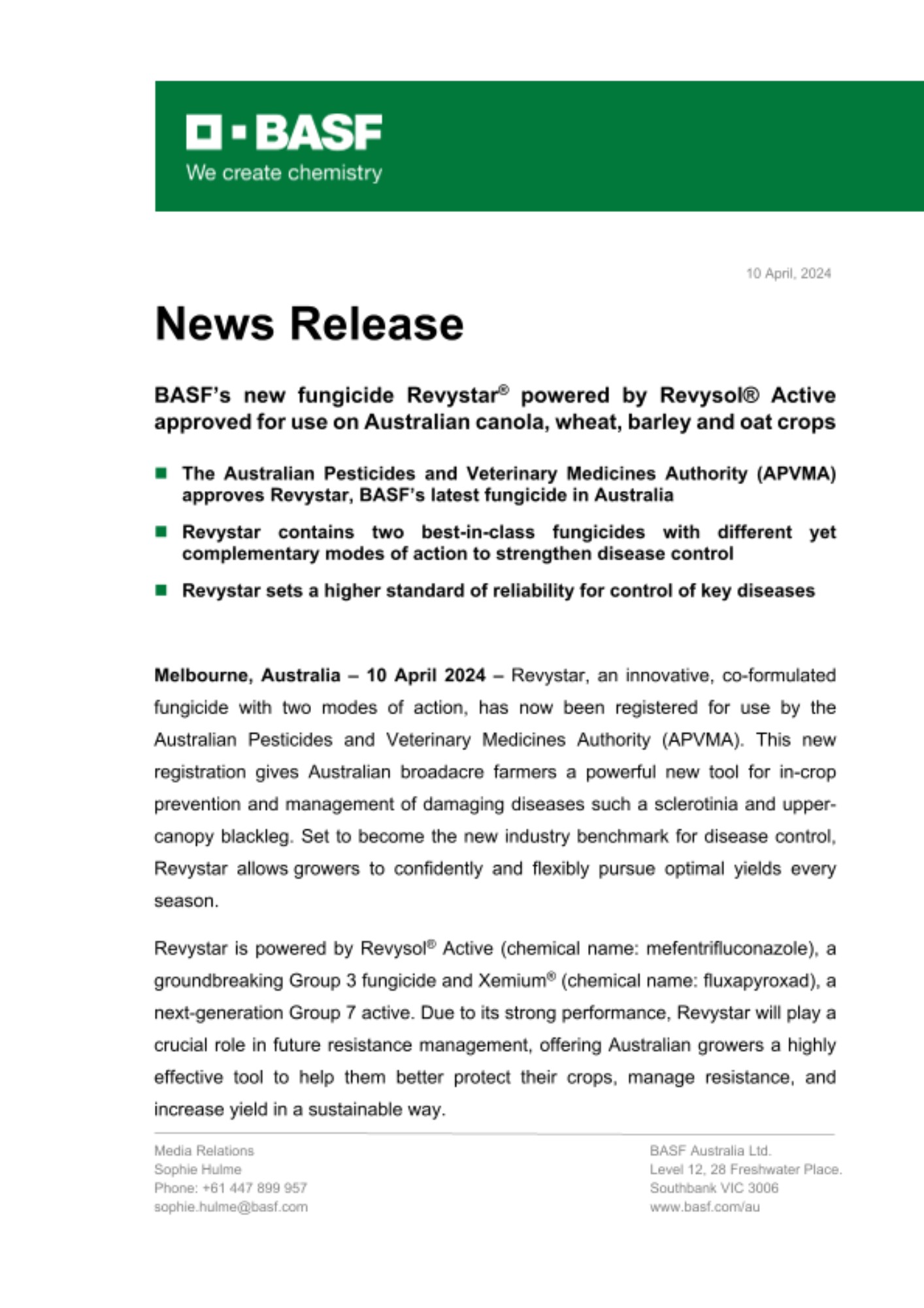 Revystar is powered by Revysol® Active (chemical name: mefentrifluconazole), a groundbreaking Group 3 fungicide and Xemium® (chemical name: fluxapyroxad), a next-generation Group 7 active. Due to its strong performance, Revystar will play a crucial role in future resistance management, offering Australian growers a highly effective tool to help them better protect their crops, manage resistance, and increase yield in a sustainable way.