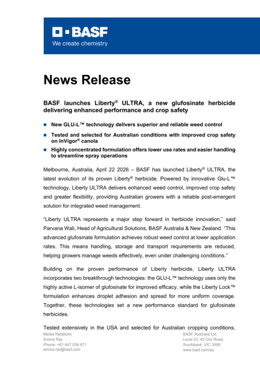 Melbourne, Australia, April 22 2026 – BASF has launched Liberty® ULTRA, the latest evolution of its proven Liberty® herbicide. Powered by innovative Glu-L™ technology, Liberty ULTRA delivers enhanced weed control, improved crop safety and greater flexibility, providing Australian growers with a reliable post-emergent solution for integrated weed management.