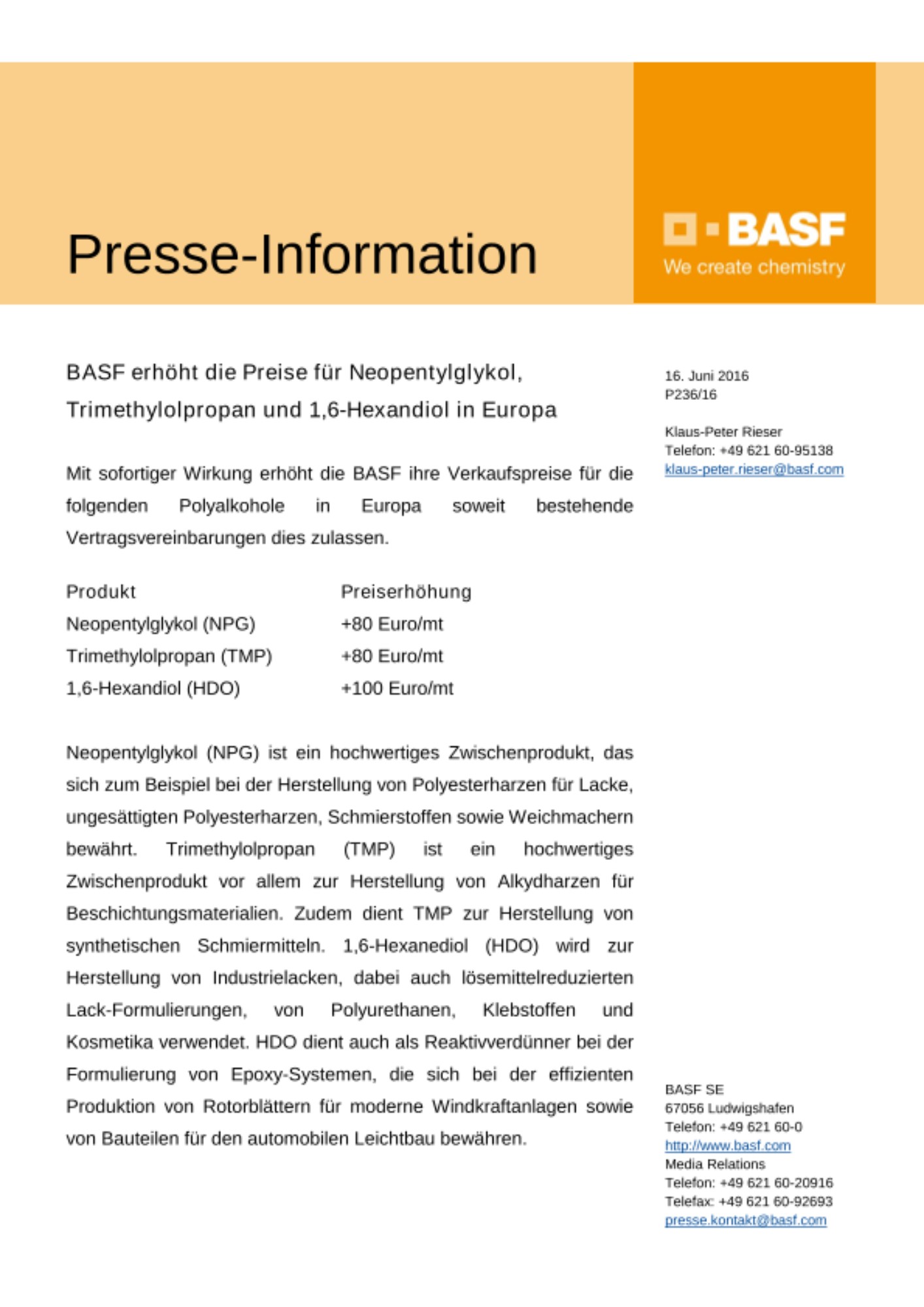Mit sofortiger Wirkung erhöht die BASF ihre Verkaufspreise für die folgenden Polyalkohole in Europa soweit bestehende Vertragsvereinbarungen dies zulassen.
