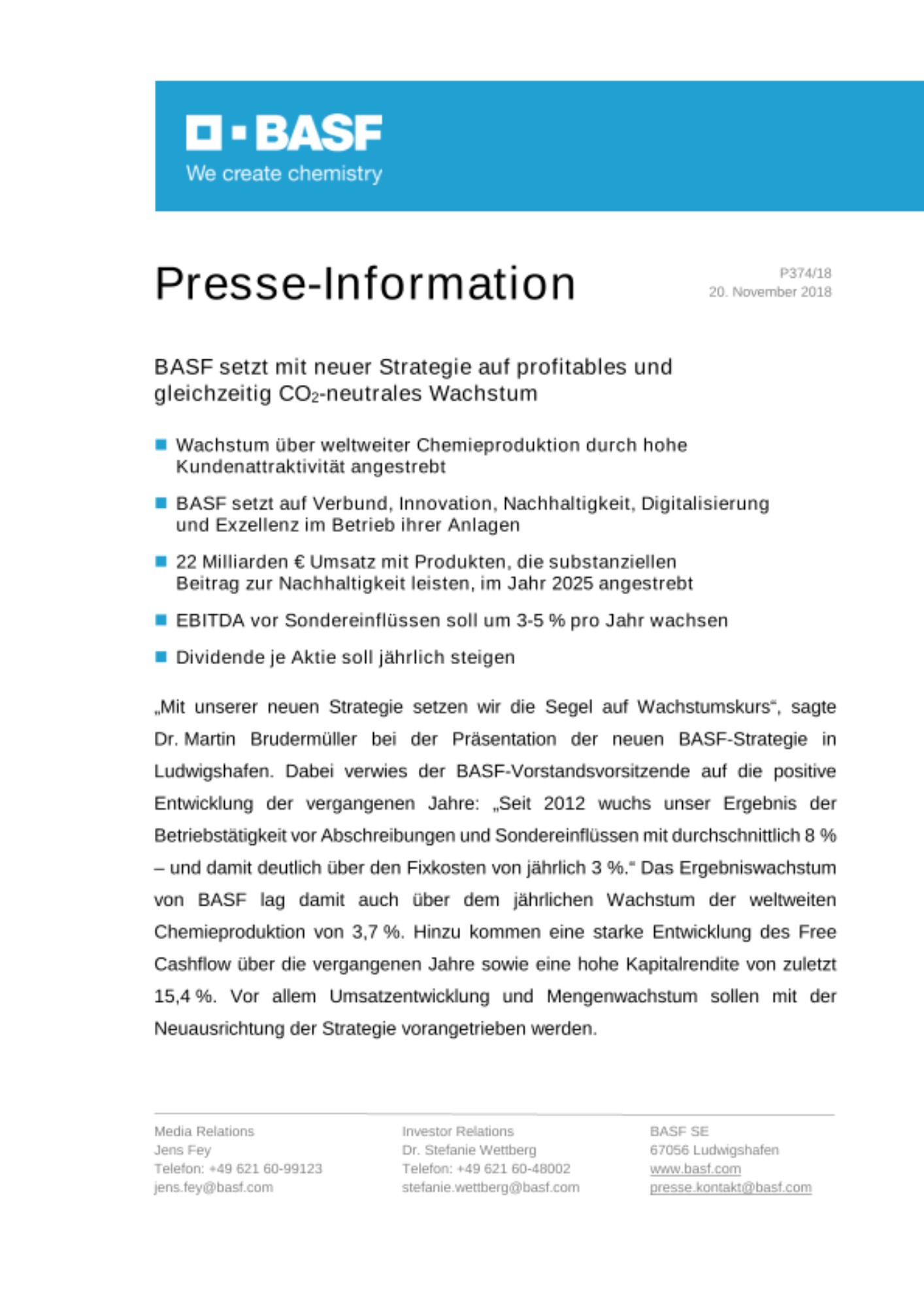 Diese Mitteilung enthält zukunftsgerichtete Aussagen. Diese Aussagen basieren auf den gegenwärtigen Einschätzungen und Prognosen des Vorstands sowie den ihm derzeit verfügbaren Informationen. Die zukunftsgerichteten Aussagen sind nicht als Garantien der darin genannten zukünftigen Entwicklungen und Ergebnisse zu verstehen. Diese sind vielmehr von einer Vielzahl von Faktoren abhängig; sie beinhalten verschiedene Risiken und Unwägbarkeiten und beruhen auf Annahmen, die sich möglicherweise als nicht zutreffend erweisen. BASF übernimmt keine über die gesetzlichen Anforderungen hinausgehende Verpflichtung, die in dieser Mitteilung getroffenen zukunftsgerichteten Aussagen zu aktualisieren.