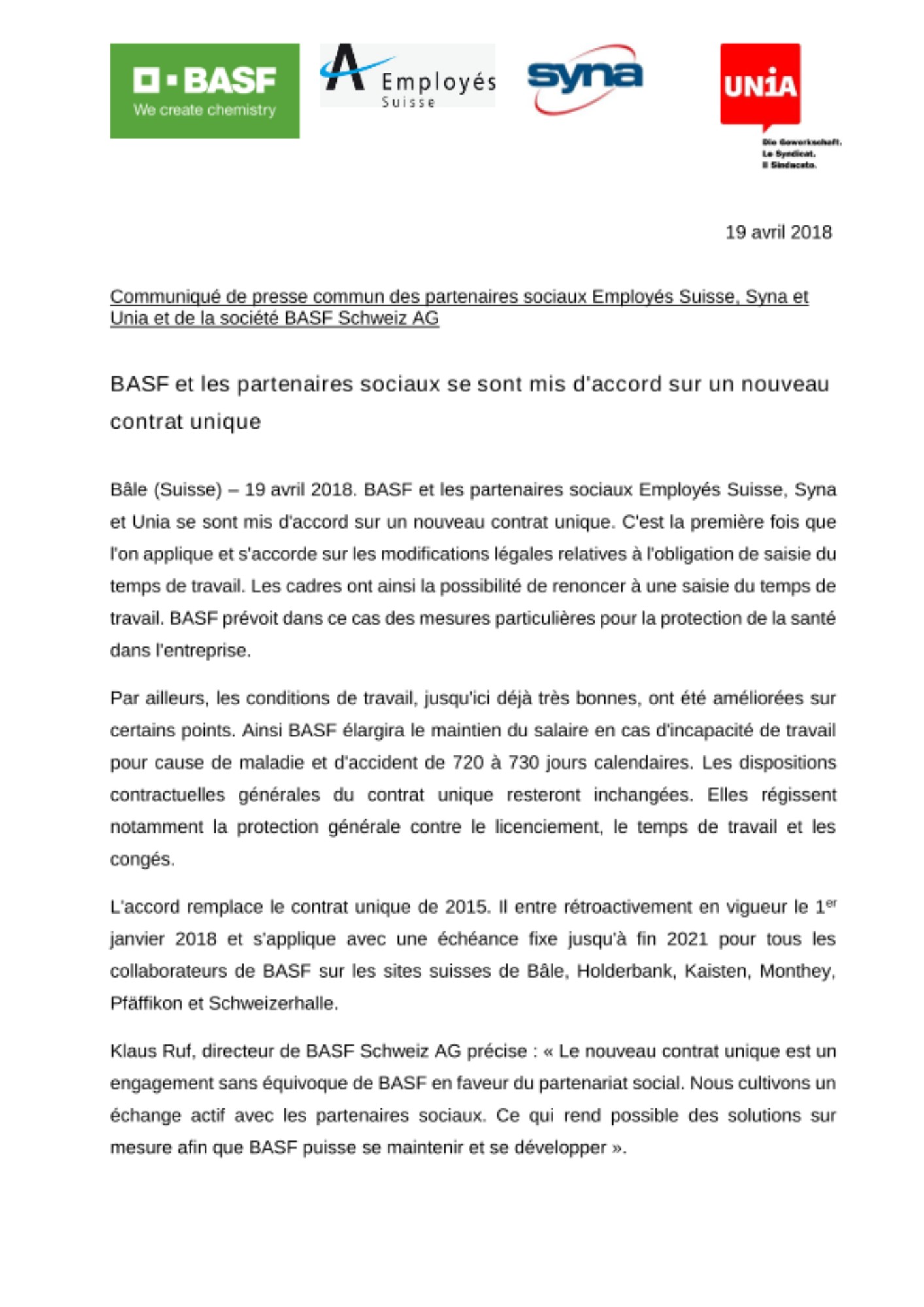 Klaus Ruf, directeur de BASF Schweiz AG précise : « Le nouveau contrat unique est un engagement sans équivoque de BASF en faveur du partenariat social. Nous cultivons un échange actif avec les partenaires sociaux. Ce qui rend possible des solutions sur mesure afin que BASF puisse se maintenir et se développer ».