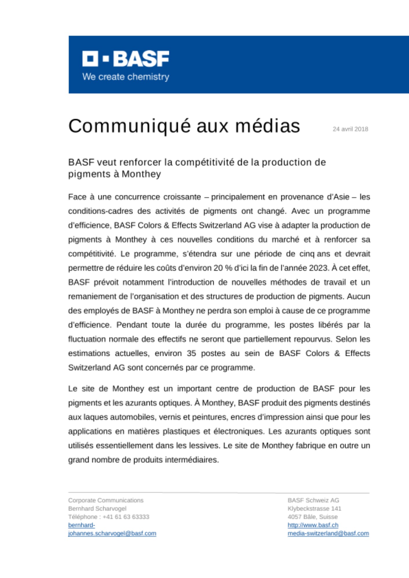 Face à une concurrence croissante – principalement en provenance d’Asie – les conditions-cadres des activités de pigments ont changé. Avec un programme d’efficience, BASF Colors & Effects Switzerland AG vise à adapter la production de pigments à Monthey à ces nouvelles conditions du marché et à renforcer sa compétitivité. Le programme, s’étendra sur une période de cinq ans et devrait permettre de réduire les coûts d’environ 20 % d’ici la fin de l’année 2023. À cet effet, BASF prévoit notamment l’introduction de nouvelles méthodes de travail et un remaniement de l’organisation et des structures de production de pigments. Aucun des employés de BASF à Monthey ne perdra son emploi à cause de ce programme d’efficience. Pendant toute la durée du programme, les postes libérés par la fluctuation normale des effectifs ne seront que partiellement repourvus. Selon les estimations actuelles, environ 35 postes au sein de BASF Colors & Effects Switzerland AG sont concernés par ce programme.