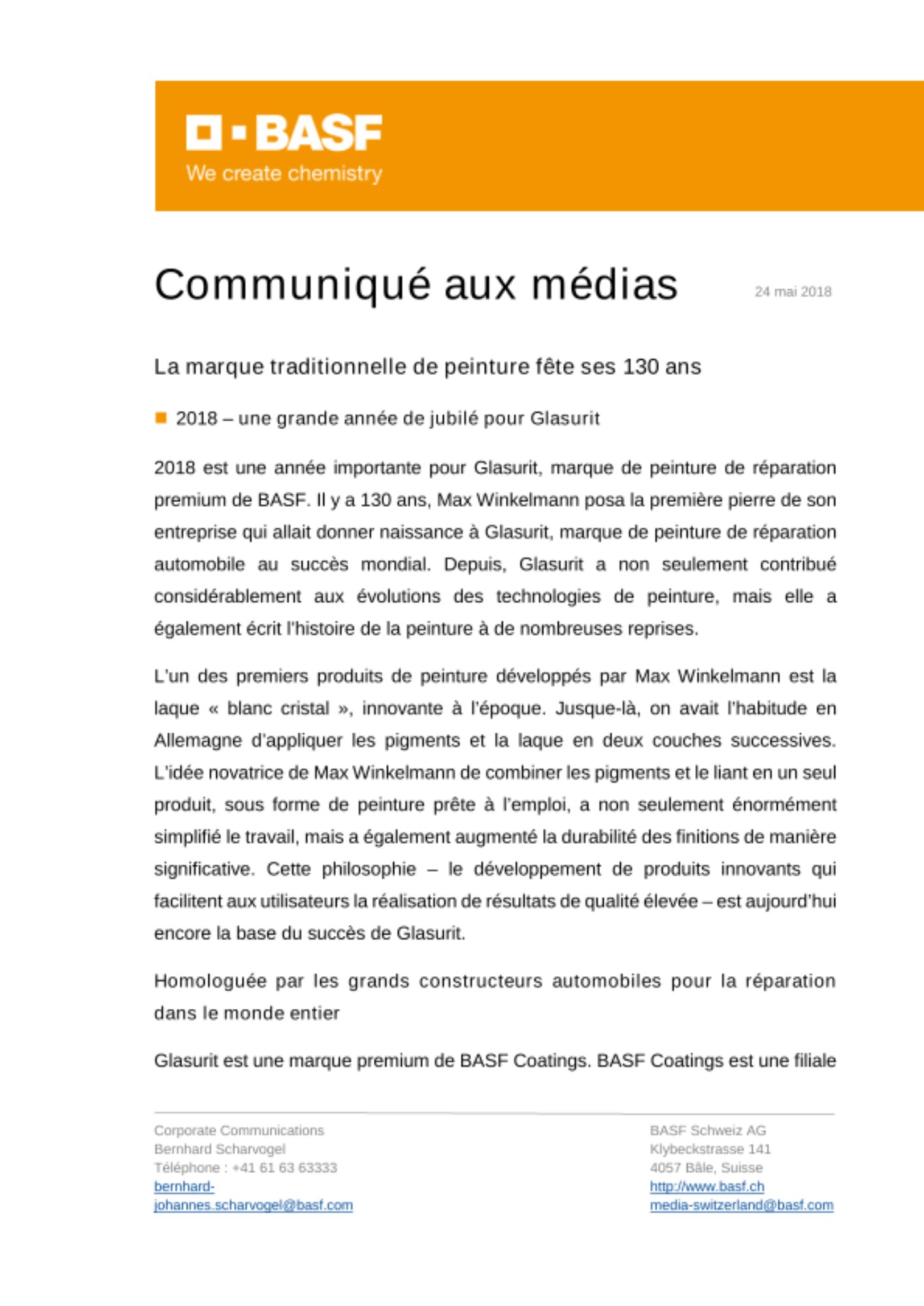 2018 est une année importante pour Glasurit, marque de peinture de réparation premium de BASF. Il y a 130 ans, Max Winkelmann posa la première pierre de son entreprise qui allait donner naissance à Glasurit, marque de peinture de réparation automobile au succès mondial. Depuis, Glasurit a non seulement contribué considérablement aux évolutions des technologies de peinture, mais elle a également écrit l’histoire de la peinture à de nombreuses reprises.