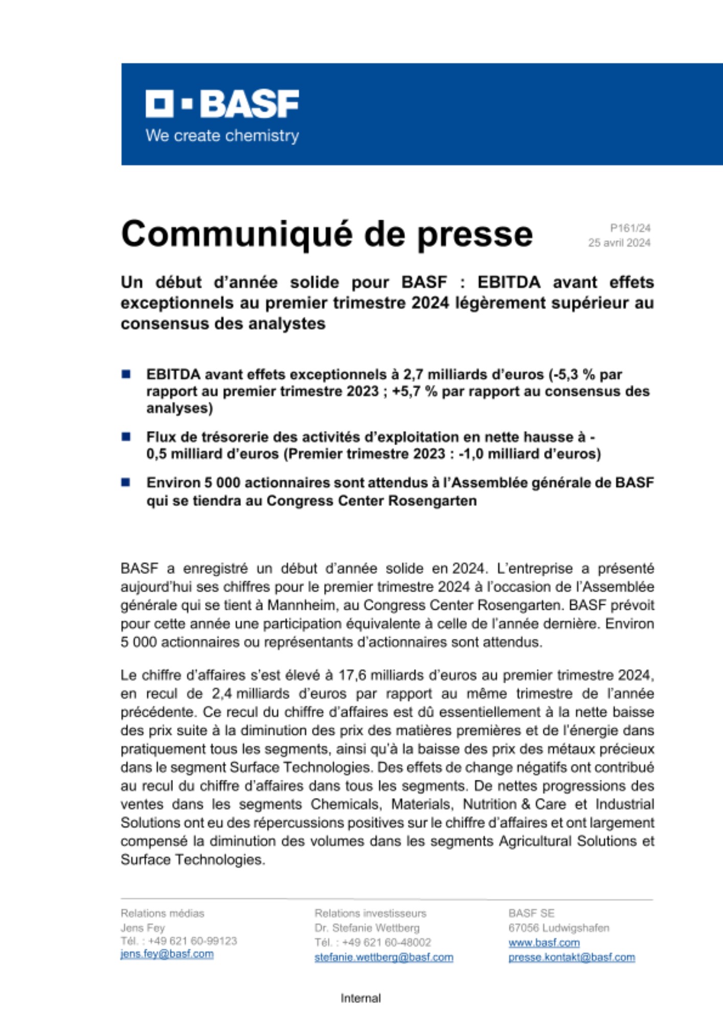 Un début d’année solide pour BASF : EBITDA avant effets exceptionnels au premier trimestre 2024 légèrement supérieur au consensus des analystes