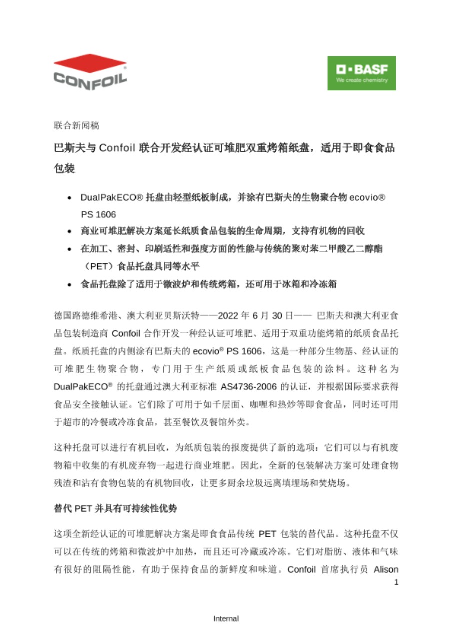 德国路德维希港、澳大利亚贝斯沃特——2022 年 6 月 30 日—— 巴斯夫和澳大利亚食品包装制造商 Confoil 合作开发一种经认证可堆肥、适用于双重功能烤箱的纸质食品托盘。纸质托盘的内侧涂有巴斯夫的 ecovio® PS 1606,这是一种部分生物基、经认证的可堆肥生物聚合物,专门用于生产纸质或纸板食品包装的涂料。这种名为 DualPakECO® 的托盘通过澳大利亚标准 AS4736-2006 的认证,并根据国际要求获得食品安全接触认证。它们除了可用于如千层面、咖喱和热炒等即食食品,同时还可用于超市的冷餐或冷冻食品,甚至餐饮及餐馆外卖。