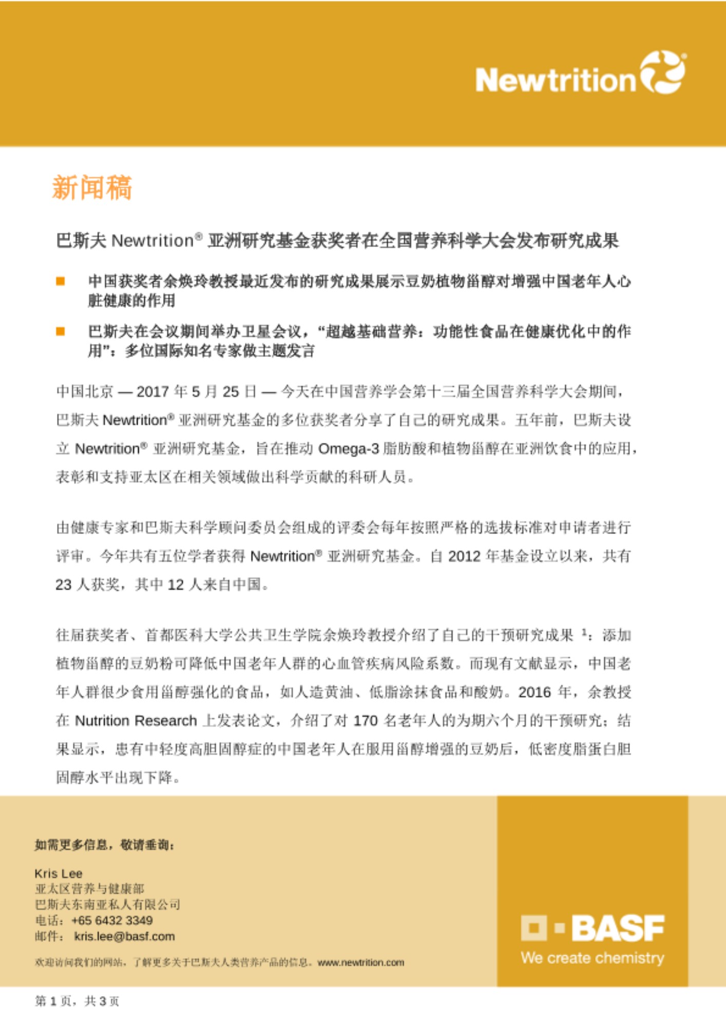 中国北京 — 2017 年 5 月 25 日 — 今天在中国营养学会第十三届全国营养科学大会期间,巴斯夫Newtrition® 亚洲研究基金的多位获奖者分享了自己的研究成果。五年前,巴斯夫设立 Newtrition® 亚洲研究基金,旨在推动 Omega-3脂肪酸和植物甾醇在亚洲饮食中的应用,表彰和支持亚太区在相关领域做出科学贡献的科研人员。