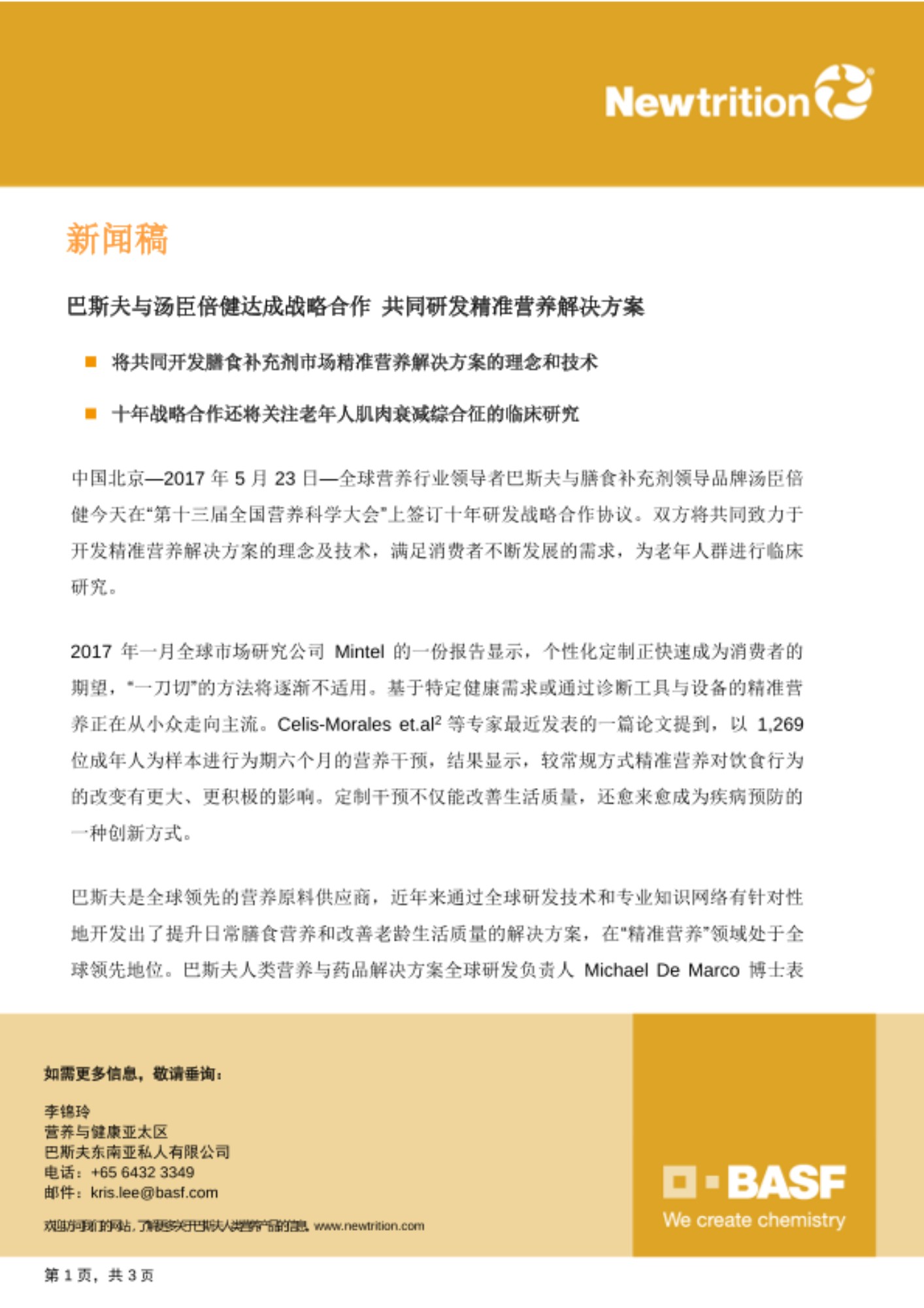 中国北京 — 2017 年 5 月 23 日 — 全球营养行业领导者巴斯夫与膳食补充剂领导品牌汤臣倍健今天在“第十三届全国营养科学大会”上签订十年研发战略合作协议。双方将共同致力于开发精准营养解决方案的理念及技术,满足消费者不断发展的需求,为老年人群进行临床研究。