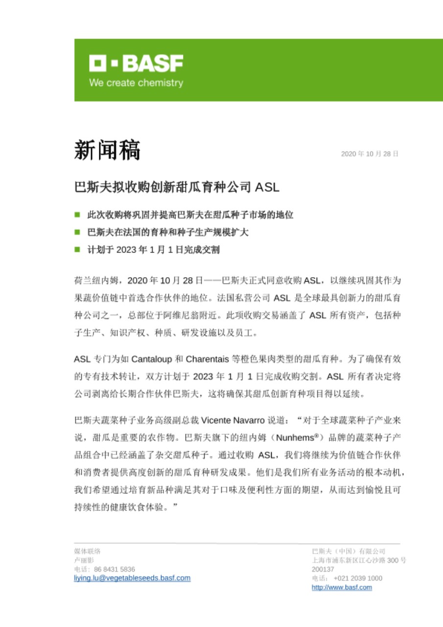 荷兰纽内姆,2020年10月28日——巴斯夫正式同意收购 ASL,以继续巩固其作为果蔬价值链中首选合作伙伴的地位。法国私营公司 ASL 是全球最具创新力的甜瓜育种公司之一,总部位于阿维尼翁附近。此项收购交易涵盖了 ASL 所有资产,包括种子生产、知识产权、种质、研发设施以及员工。