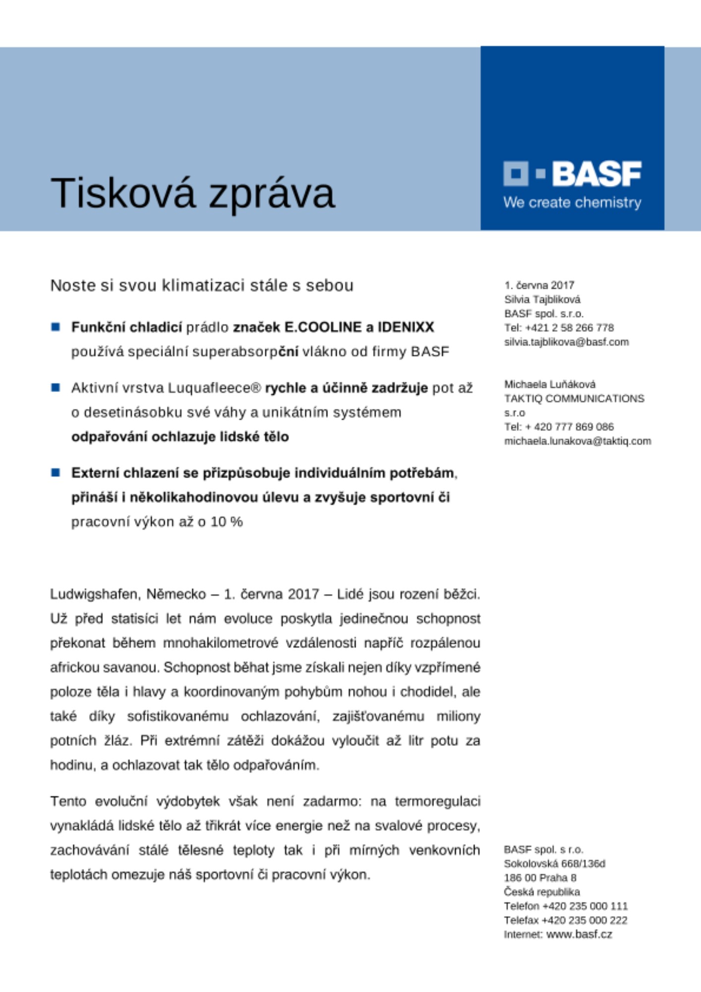 Jako příklad aplikace tohoto produktu můžeme uvést chladicí vesty. Ty jsou snadno použitelné a lze je nosit jako standardní součást oděvu. Rychle absorbují pot a prostřednictvím bakteriostatické textilie jej odvádějí do aktivní vrstvy Luquafleece® z dílny BASF. „Vlákna této netkané textilie jsou za pomocí speciální technologie potažena superabsorpčními polymery (SAP). Díky nim dokáží v řádu několika vteřin zadržet i udržet množství vody odpovídající až desetinásobku její vlastní hmotnosti,“ vysvětluje Norbert Heidinger, odborník z firmy BASF New Business GmbH.