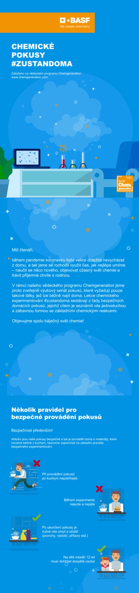 V rámci našeho vědeckého programu Chemgeneration jsme proto zveřejnili výukový seriál pokusů, které vyžadují pouze takové látky, jež lze běžně najít doma. Lekce chemického experimentování #zustandoma sestávají z řady bezpečných domácích pokusů, jejichž cílem je seznámit vás jednoduchou a zábavnou formou se základními chemickými reakcemi.