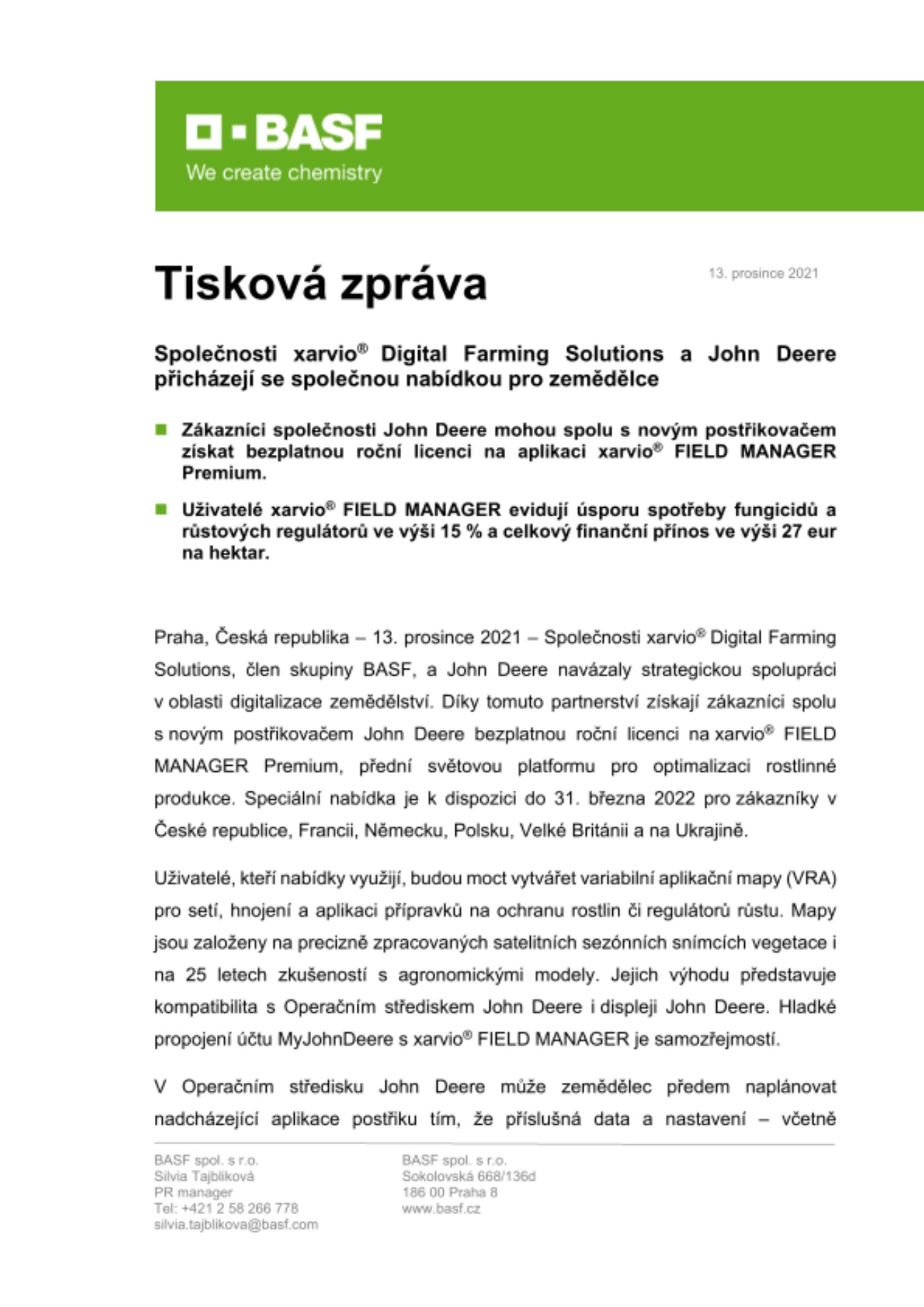 Praha, Česká republika – 13. prosince 2021 – Společnosti xarvio® Digital Farming Solutions, člen skupiny BASF, a John Deere navázaly strategickou spolupráci v oblasti digitalizace zemědělství. Díky tomuto partnerství získají zákazníci spolu s novým postřikovačem John Deere bezplatnou roční licenci na xarvio® FIELD MANAGER Premium, přední světovou platformu pro optimalizaci rostlinné produkce. Speciální nabídka je k dispozici do 31. března 2022 pro zákazníky v České republice, Francii, Německu, Polsku, Velké Británii a na Ukrajině.