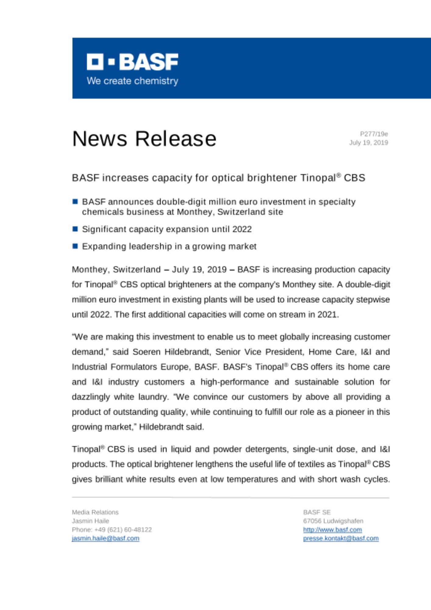 Monthey, Switzerland – July 19, 2019 – BASF is increasing production capacity for Tinopal® CBS optical brighteners at the company's Monthey site. A double-digit million euro investment in existing plants will be used to increase capacity stepwise until 2022. The first additional capacities will come on stream in 2021.