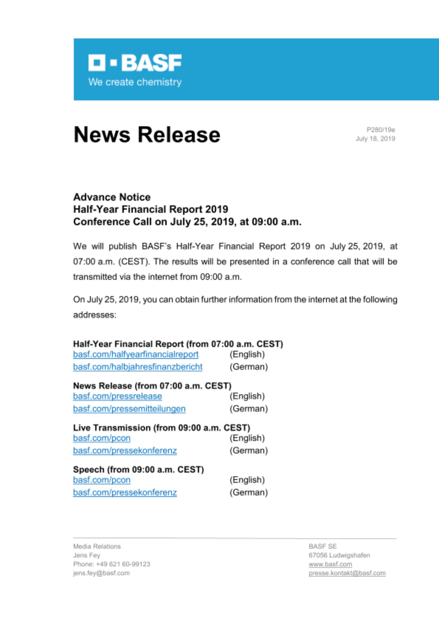 We will publish BASF’s Half-Year Financial Report 2019 on July 25, 2019, at 07:00 a.m. (CEST). The results will be presented in a conference call that will be transmitted via the internet from 09:00 a.m.