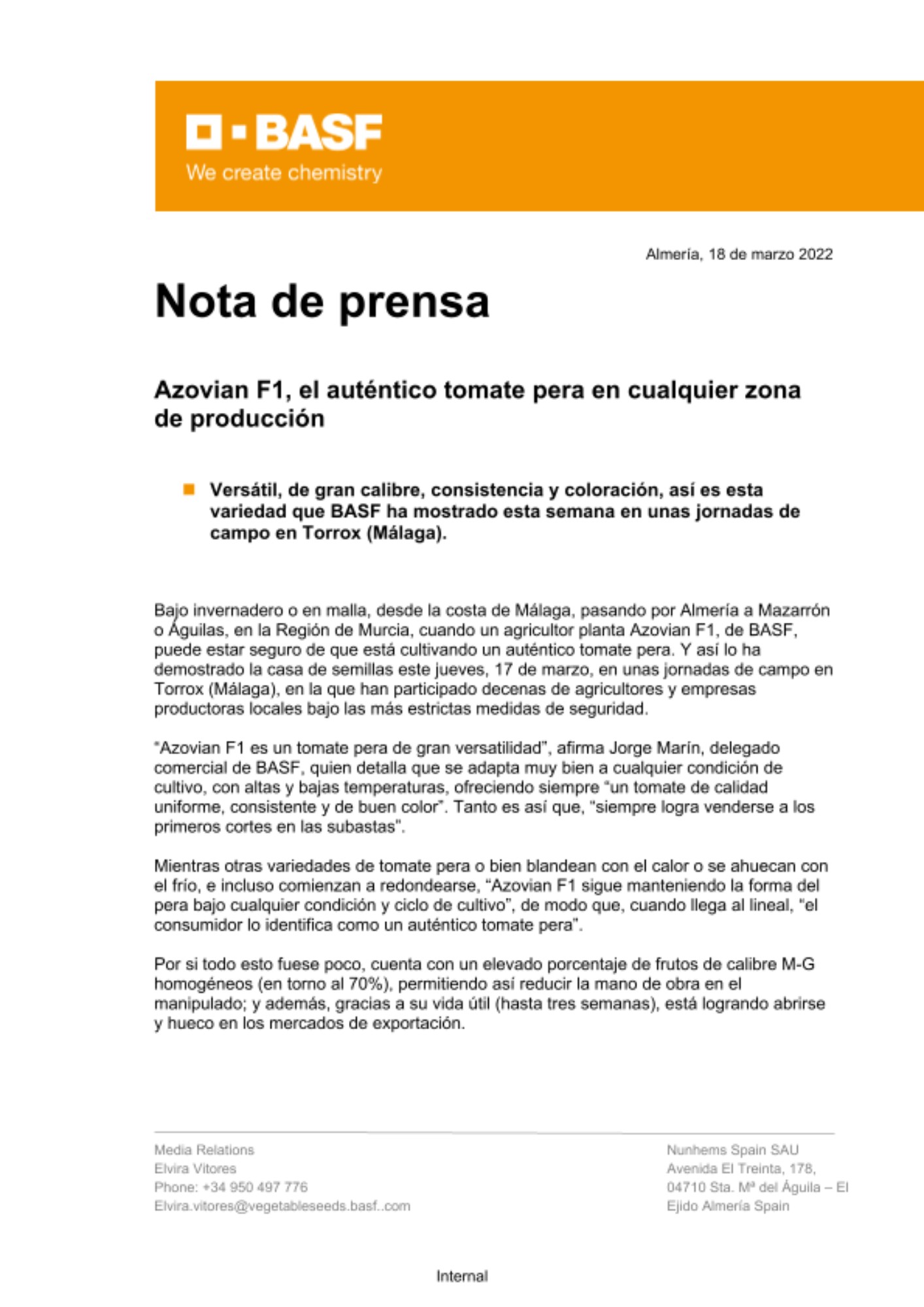 Bajo invernadero o en malla, desde la costa de Málaga, pasando por Almería a Mazarrón o Águilas, en la Región de Murcia, cuando un agricultor planta Azovian F1, de BASF, puede estar seguro de que está cultivando un auténtico tomate pera. Y así lo ha demostrado la casa de semillas este jueves, 17 de marzo, en unas jornadas de campo en Torrox (Málaga), en la que han participado decenas de agricultores y empresas productoras locales bajo las más estrictas medidas de seguridad.