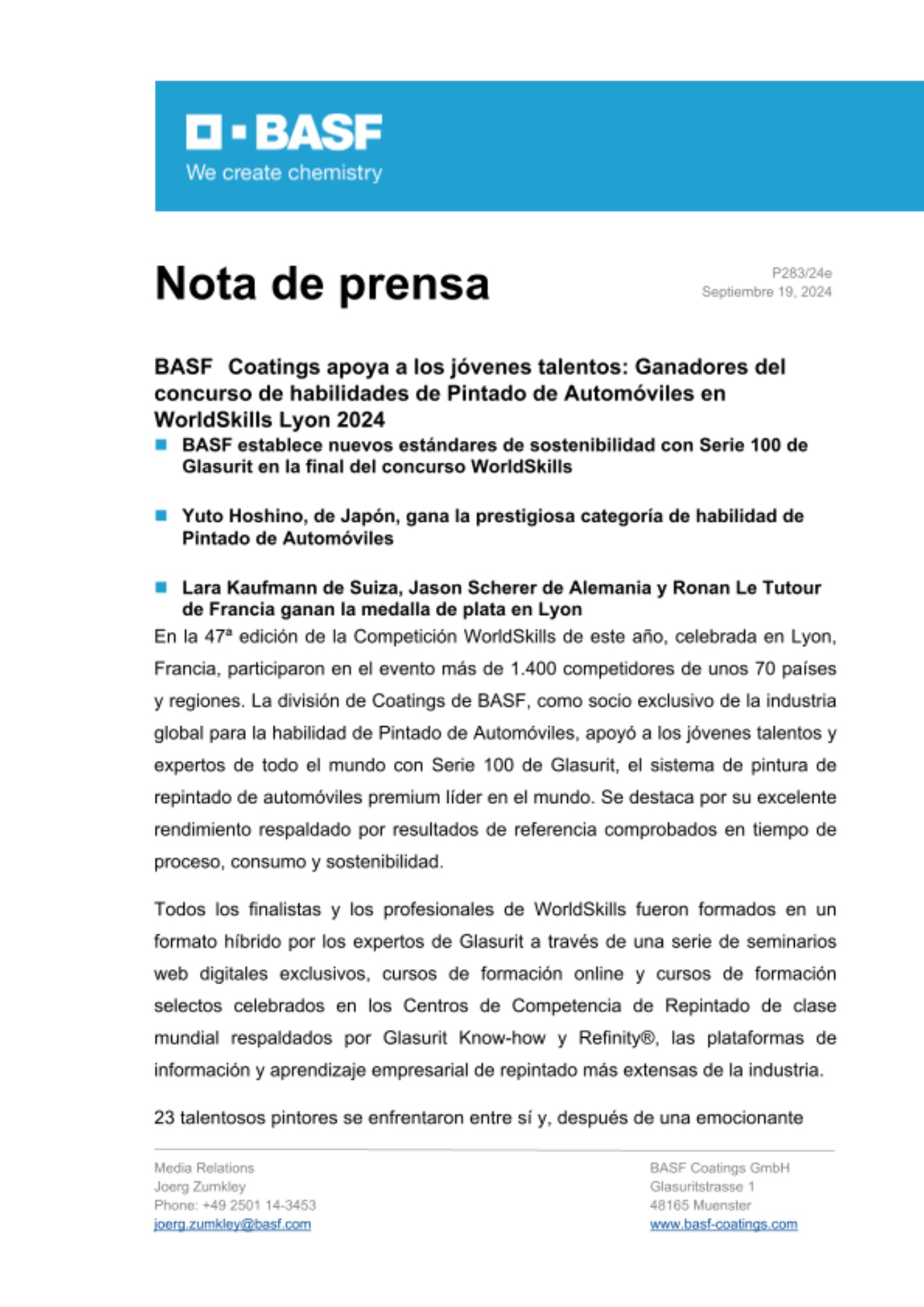 "WorldSkills Lyon 2024 ha sido un evento realmente inspirador este año, espectacular en todos los sentidos. La pasión y la excelencia mostradas por el alto calibre de talento en la competencia de habilidades de Pintado de Automóviles ha sido fenomenal. Hemos subido el listón con Serie 100 de Glasurit y estamos estableciendo nuevos estándares para el desarrollo sostenible de las habilidades requeridas por la industria. Con WorldSkills y nuestros socios de formación, estamos comprometidos a ofrecer una fuerza laboral aún más diversa y altamente cualificada para liderar el futuro de la reparación de colisiones", dijo Chris Titmarsh, vicepresidente senior global de Automotive Refinish Coatings, BASF.