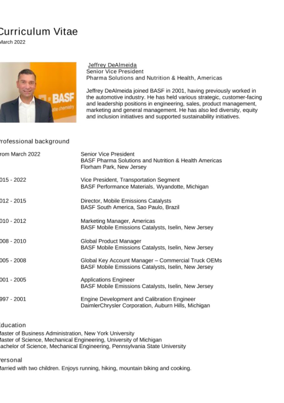 FLORHAM PARK, NJ, February 28, 2022 – BASF Corporation today announced the appointment of Jeffrey DeAlmeida to the role of Senior Vice President, Pharma Solutions and Nutrition & Health Americas, effective March 1, 2022. He succeeds Christian Seufert, who has decided to transition to a role outside the company.