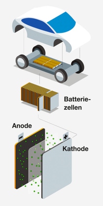Die Batterie besteht aus Zellen mit jeweils einer positiven und einer negativen Elektrode. Die Kathode besteht aus Nickel, Kobalt und Aluminium (NCA) oder Nickel, Kobalt und Mangan (NCM), die Anode aus Graphit. Lithium-Ionen transportieren die Ladung der Batterie zwischen den Elektroden hin und her. Dadurch wird elektrische Energie erzeugt, die in mechanische Energie zum Betrieb des Fahrzeugs umgewandelt wird.