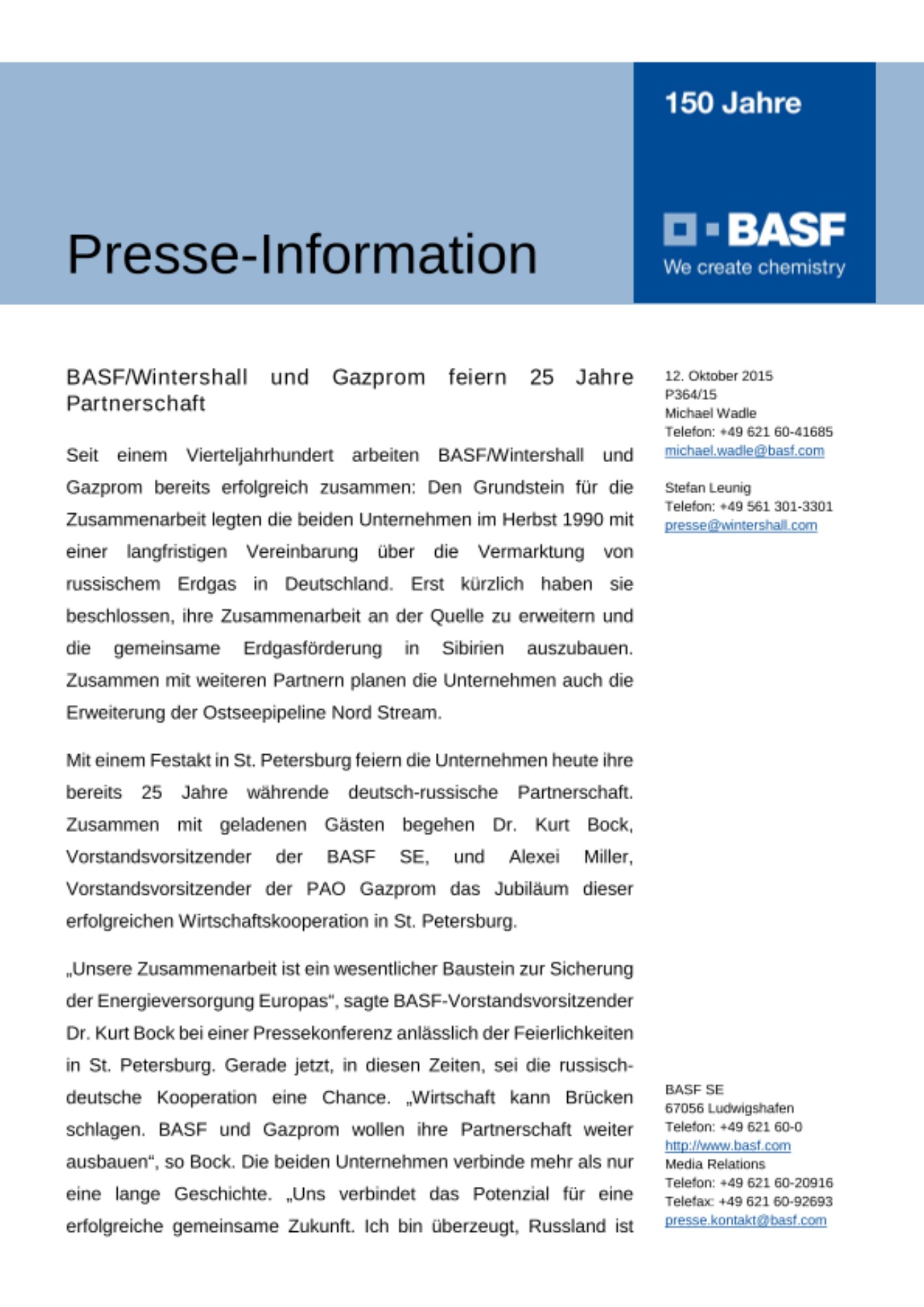 Mit einem Festakt in St. Petersburg feiern die Unternehmen heute ihre bereits 25 Jahre währende deutsch-russische Partnerschaft. Zusammen mit geladenen Gästen begehen Dr. Kurt Bock, Vorstandsvorsitzender der BASF SE, und Alexei Miller, Vorstandsvorsitzender der PAO Gazprom das Jubiläum dieser erfolgreichen Wirtschaftskooperation in St. Petersburg.