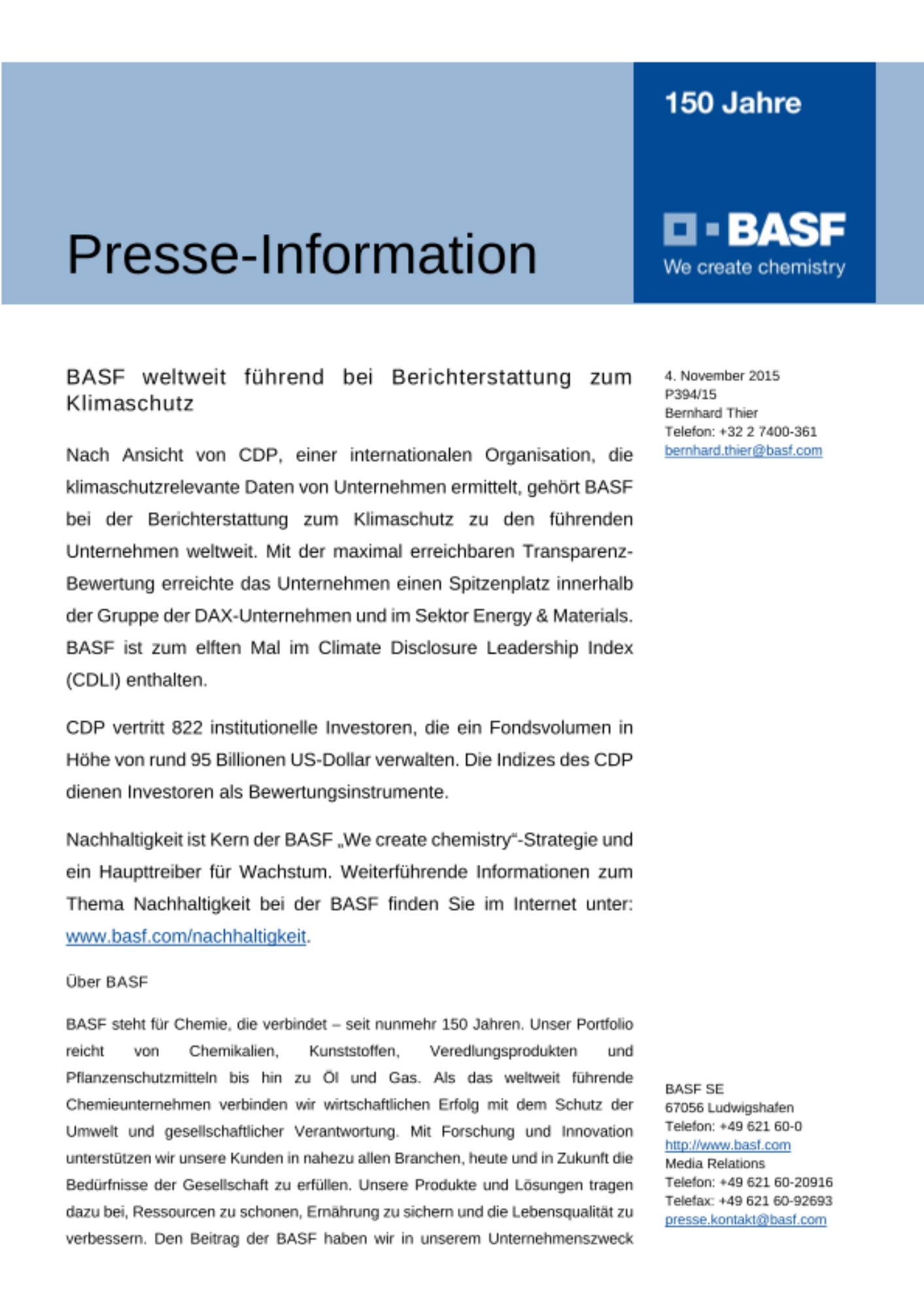 Nach Ansicht von CDP, einer internationalen Organisation, die klimaschutzrelevante Daten von Unternehmen ermittelt, gehört BASF bei der Berichterstattung zum Klimaschutz zu den führenden Unternehmen weltweit. Mit der maximal erreichbaren Transparenz-Bewertung erreichte das Unternehmen einen Spitzenplatz innerhalb der Gruppe der DAX-Unternehmen und im Sektor Energy & Materials. BASF ist zum elften Mal im Climate Disclosure Leadership Index (CDLI) enthalten.