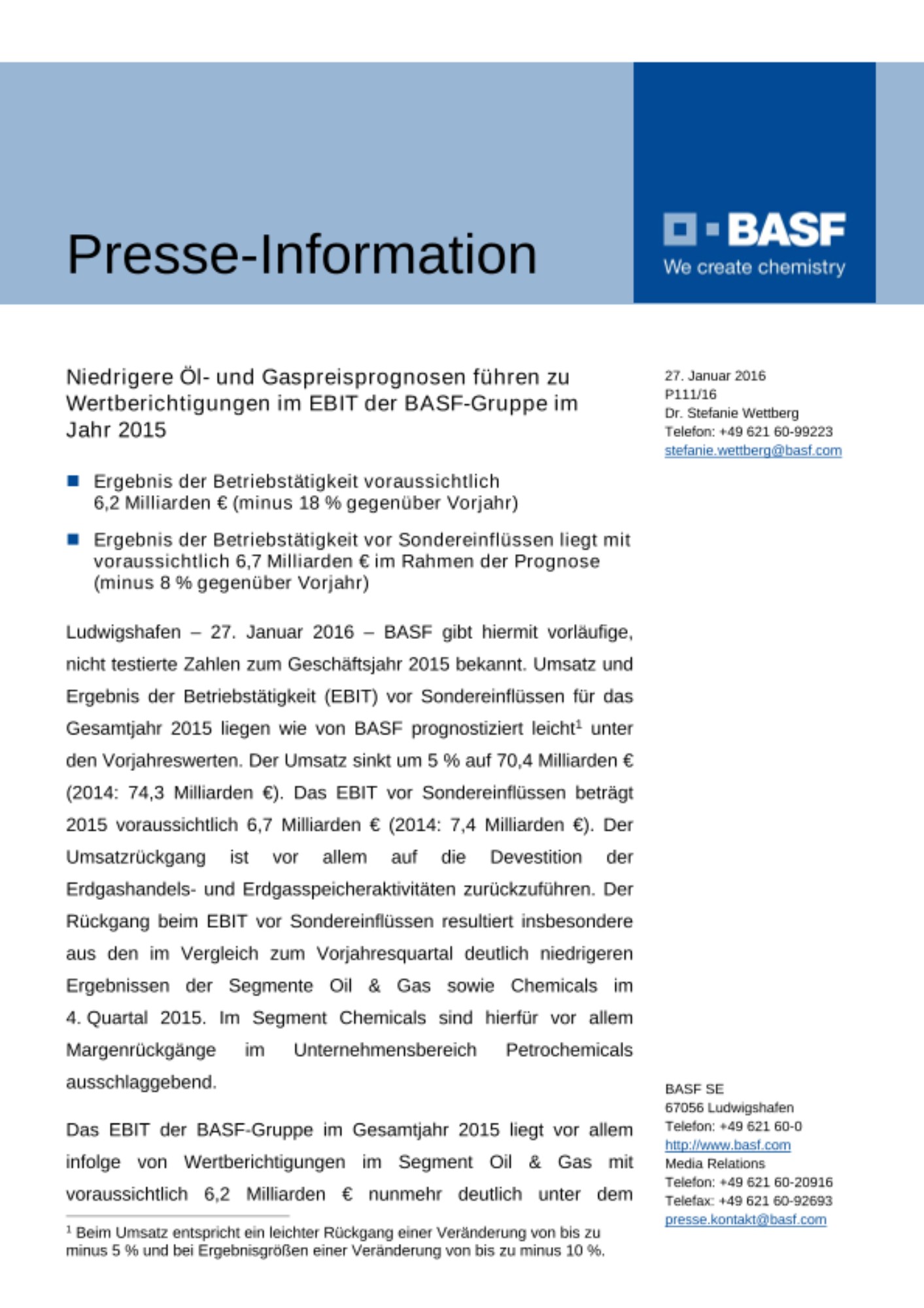 Das EBIT der BASF-Gruppe im Gesamtjahr 2015 liegt vor allem infolge von Wertberichtigungen im Segment Oil & Gas mit voraussichtlich 6,2 Milliarden € nunmehr deutlich unter dem Vorjahreswert (2014: 7,6 Milliarden €). Das Unternehmen erwartete bisher einen nur leichten Rückgang des EBIT für das Gesamtjahr 2015. Grund für die Wertberichtigungen im Segment Oil & Gas sind die starken Rückgänge der Öl- und Gaspreise in den vergangenen Monaten. BASF erwartet, dass die Öl- und Gaspreise im Jahr 2016 auf einem niedrigen Niveau verbleiben werden. Auch die Annahmen für die Öl- und Gaspreise in den Folgejahren wurden reduziert. Dies führt zu Wertberichtigungen im Segment Oil & Gas in Höhe von rund 600 Millionen €. Dieser Betrag belastet im 4. Quartal 2015 als nicht liquiditätswirksamer Sondereinfluss das EBIT des Segments Oil & Gas.