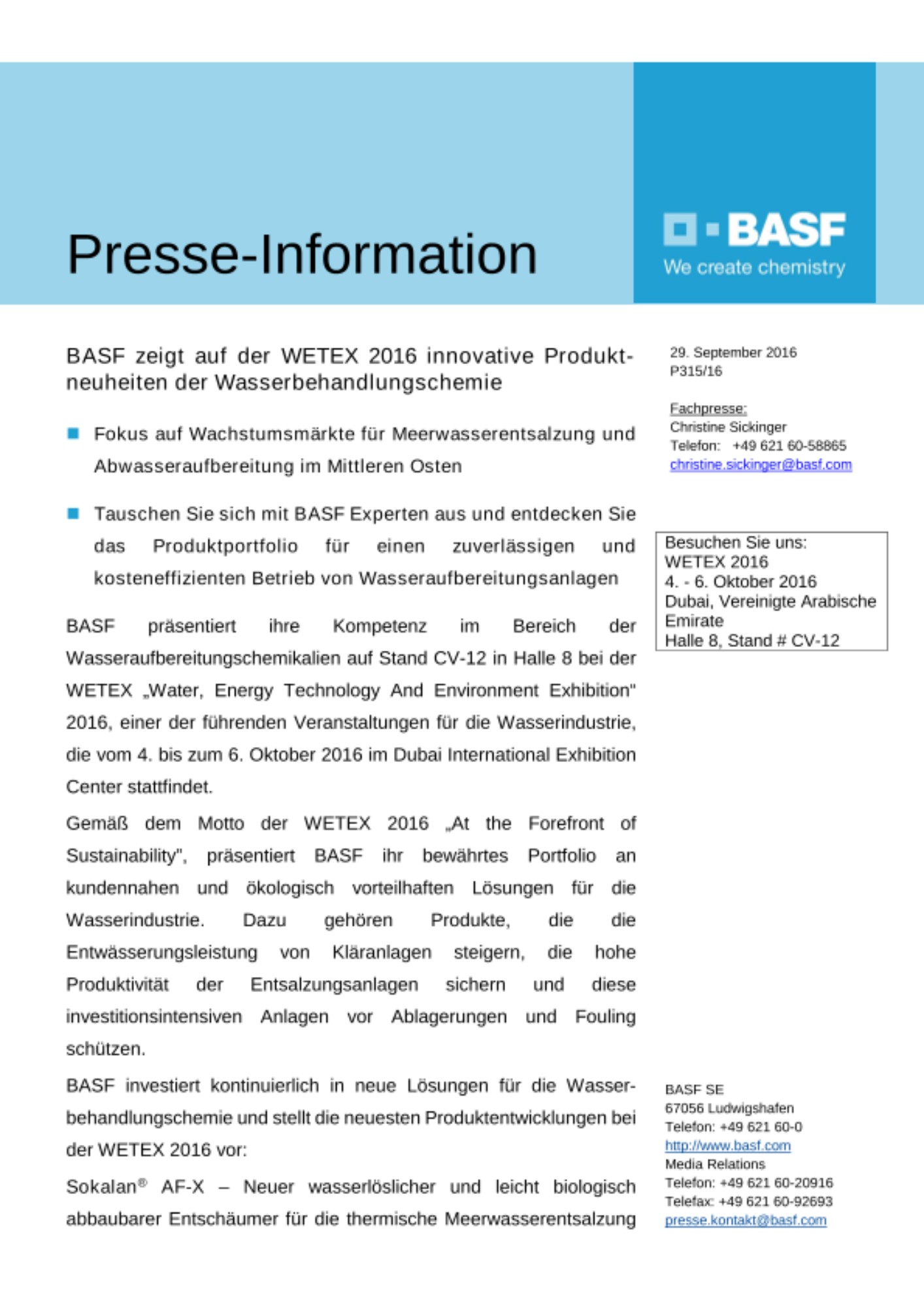 BASF präsentiert ihre Kompetenz im Bereich der Wasseraufbereitungschemikalien auf Stand CV-12 in Halle 8 bei der WETEX „Water, Energy Technology And Environment Exhibition“ 2016, einer der führenden Veranstaltungen für die Wasserindustrie, die vom 4. bis zum 6. Oktober 2016 im Dubai International Exhibition Center stattfindet.