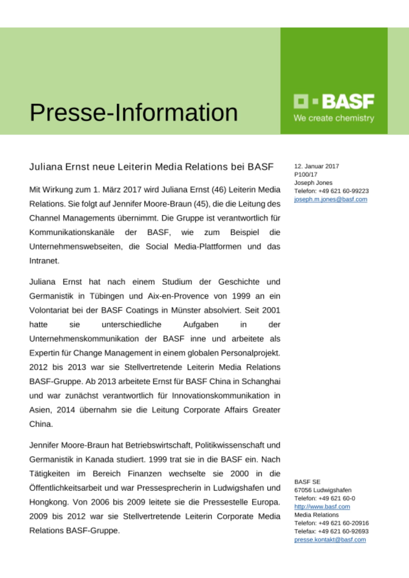 Mit Wirkung zum 1. März 2017 wird Juliana Ernst (46) Leiterin Media Relations. Sie folgt auf Jennifer Moore-Braun (45), die die Leitung des Channel Managements übernimmt. Die Gruppe ist verantwortlich für Kommunikationskanäle der BASF, wie zum Beispiel die Unternehmenswebseiten, die Social Media-Plattformen und das Intranet.