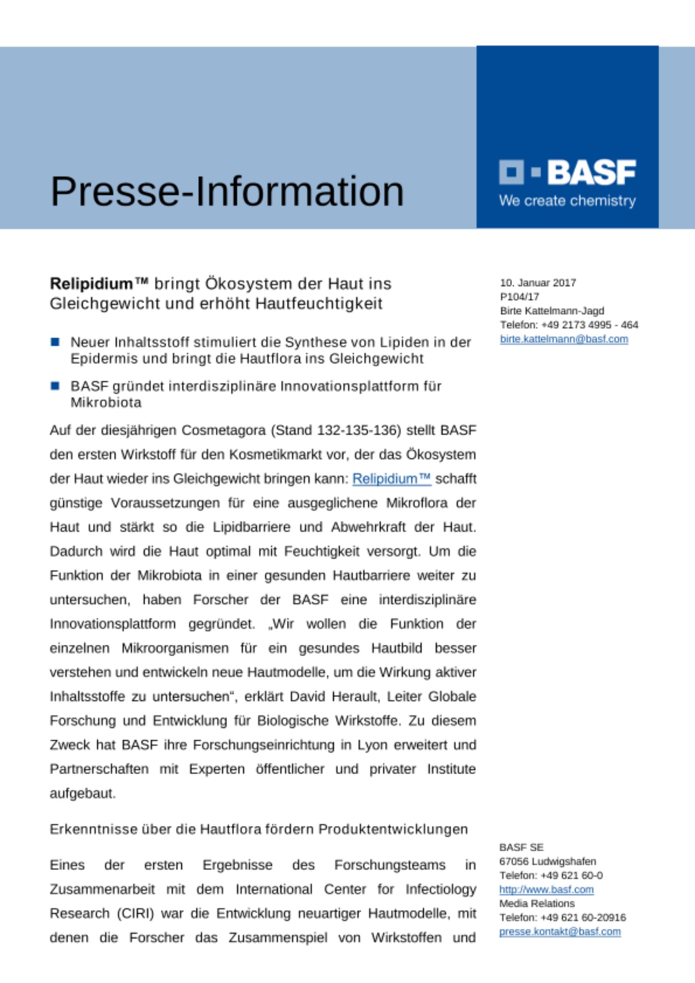 Um der Austrocknung der Haut entgegenzuwirken, hat BASF Relipidium entwickelt. Basierend auf In-vivo-Ergebnissen für die Hautflora, ist dies der erste Wirkstoff, der das Ökosystem der Haut wieder ins Gleichgewicht bringt, so die Barrierefunktion wiederherstellt und die Haut mit Feuchtigkeit versorgt. Relipidium stimuliert die Synthese von Lipiden in der Epidermis, wodurch die Barriere schneller wiederaufgebaut und die Abwehrkraft der Haut gestärkt wird. Dabei stellt der Wirkstoff das Gleichgewicht der Haut wieder her, ohne die Mikroflora der Haut zu schädigen. Dies geschieht durch bakterielle Biofermentation von Hefehydrolysat mithilfe des Lactobacillus plantarum – ohne antibiotische oder präbiotische Wirkung. In-vivo konnte nachgewiesen werden, dass Relipidium schon innerhalb von zwei Wochen die Versorgung der Haut mit Feuchtigkeit um zwölf Prozent erhöht und eine Zunahme des nützlichen Bakteriums Staphylococcus epidermidis um den Faktor 2 ermöglicht. Das gestörte mikrobielle Gleichgewicht trockener Haut wurde wiederhergestellt und das Verhältnis zwischen Staphylococcus epidermidis und dem pathogenen Bakterium Staphylococcus aureus wurde um den Faktor 2,3 erhöht. Relipidium wird im letzten Verarbeitungsschritt bei Temperaturen unter 30°C hinzugefügt und bei Kaltverarbeitung bei Zimmertemperatur eingearbeitet. Die empfohlene Dosis beträgt ein bis zwei Prozent.