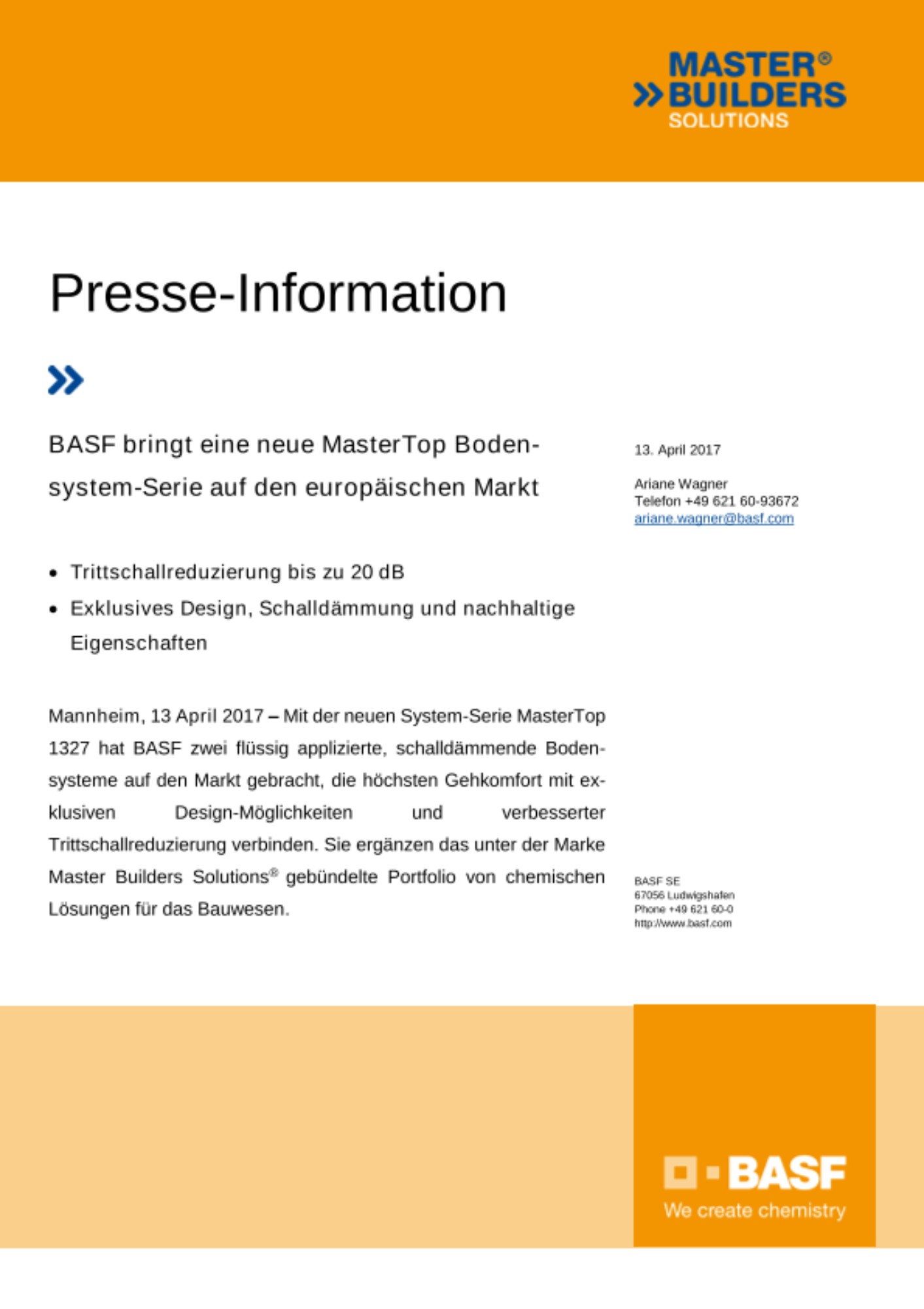 MasterTop 1327-20dB ist darüber hinaus Teil der erst kürzlich gestarteten Nachhaltigkeitskampagne der BASF: Die Master Builders Solutions-Experten von BASF zeigen gemeinsam mit europäischen Kunden ausgewählte Projekte, bei denen sich durch hochwertige Chemie beim Kunden sowohl die Produktivität steigern als auch Betriebskosten und CO2-Emissionen senken lassen. Eine besondere Erfolgsgeschichte über die mit MasterTop 1327-20dB am Arbeitsplatz erzielte Lärmminderung ist verfügbar unter: www.sustainability.master-builders-solutions.basf.com