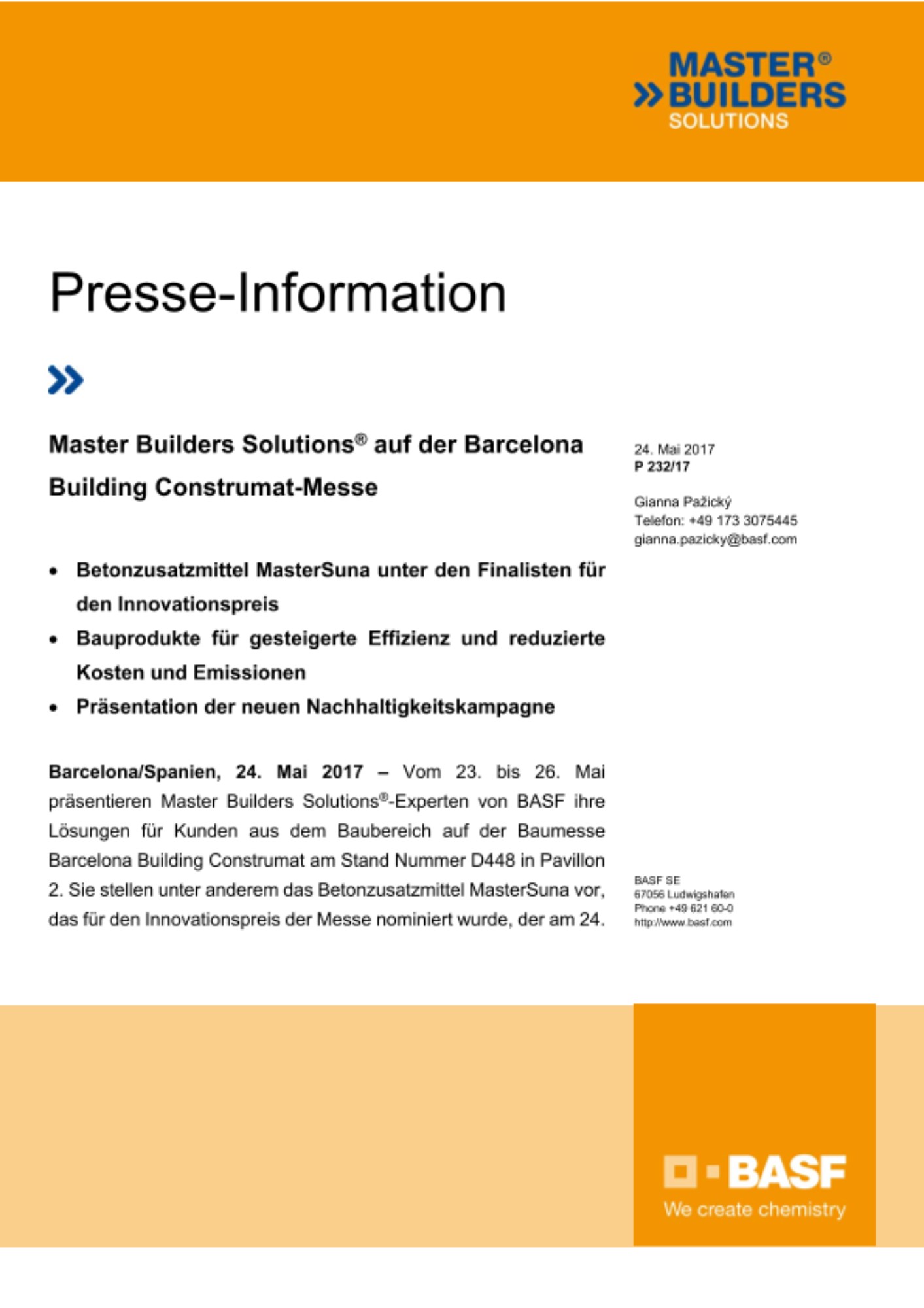 Barcelona/Spanien, 24. Mai 2017 – Vom 23. bis 26. Mai präsentieren Master Builders Solutions®-Experten von BASF ihre Lösungen für Kunden aus dem Baubereich auf der Baumesse Barcelona Building Construmat am Stand Nummer D448 in Pavillon 2. Sie stellen unter anderem das Betonzusatzmittel MasterSuna vor, das für den Innovationspreis der Messe nominiert wurde, der am 24. Mai verliehen wird.
