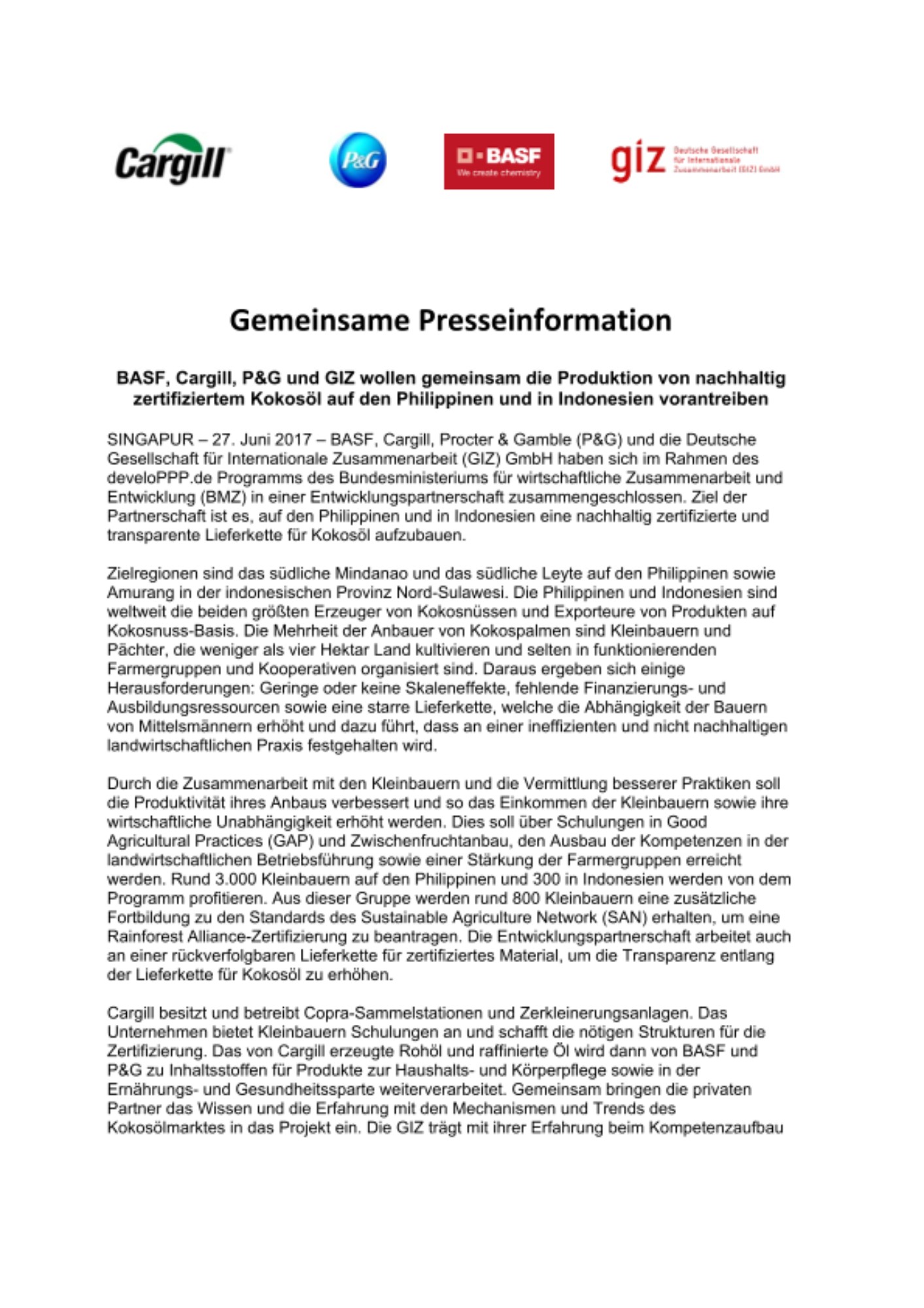 SINGAPUR – 27. Juni 2017 – BASF, Cargill, Procter & Gamble (P&G) und die Deutsche Gesellschaft für Internationale Zusammenarbeit (GIZ) GmbH haben sich im Rahmen des develoPPP.de Programms des Bundesministeriums für wirtschaftliche Zusammenarbeit und Entwicklung (BMZ) in einer Entwicklungspartnerschaft zusammengeschlossen. Ziel der Partnerschaft ist es, auf den Philippinen und in Indonesien eine nachhaltig zertifizierte und transparente Lieferkette für Kokosöl aufzubauen.
