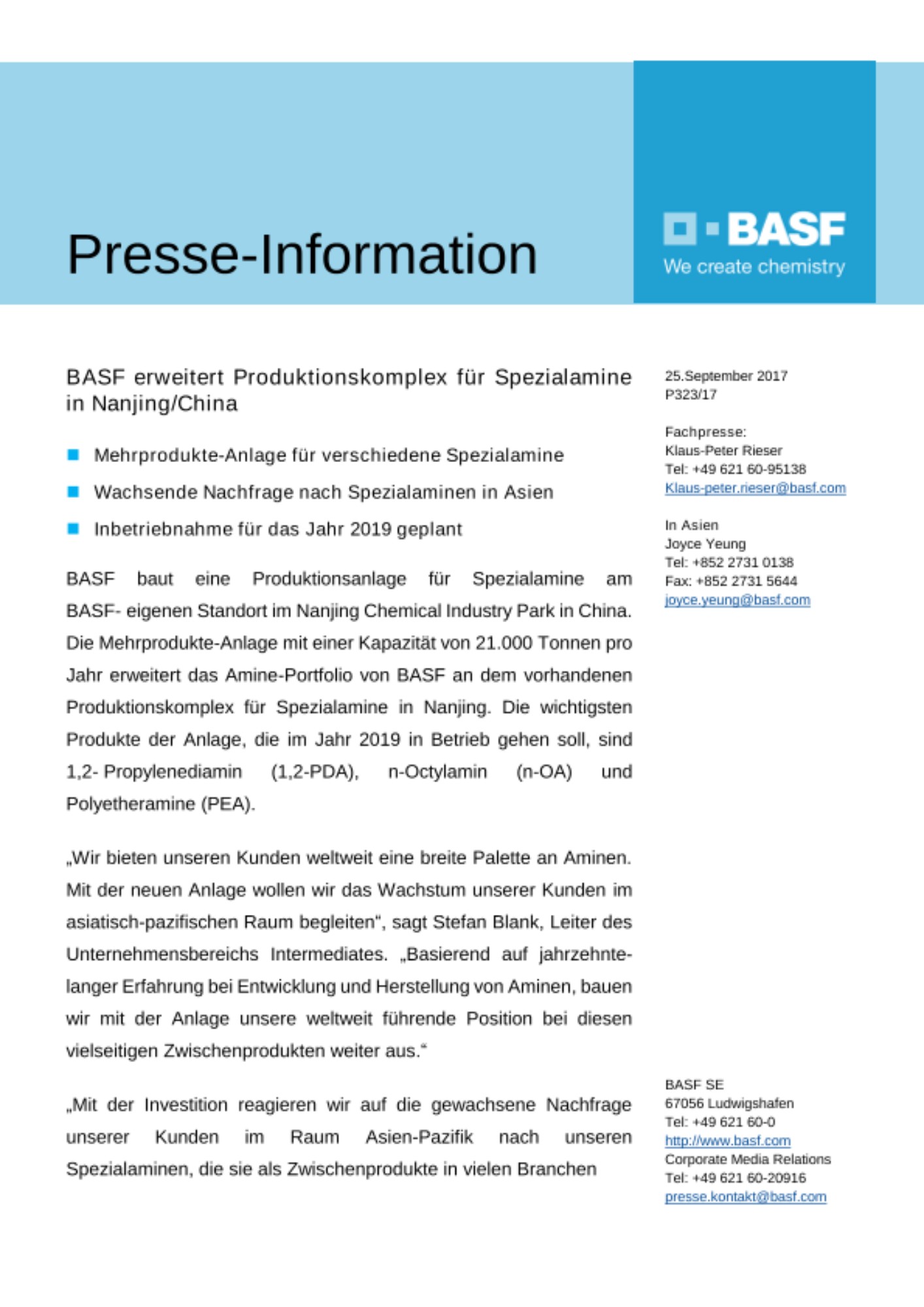 BASF baut eine Produktionsanlage für Spezialamine am BASF-eigenen Standort im Nanjing Chemical Industry Park in China. Die Mehrprodukte-Anlage mit einer Kapazität von 21.000 Tonnen pro Jahr erweitert das Amine-Portfolio von BASF an dem vorhandenen Produktionskomplex für Spezialamine in Nanjing. Die wichtigsten Produkte der Anlage, die im Jahr 2019 in Betrieb gehen soll, sind 1,2- Propylenediamin (1,2-PDA), n-Octylamin (n-OA) und Polyetheramine (PEA).
