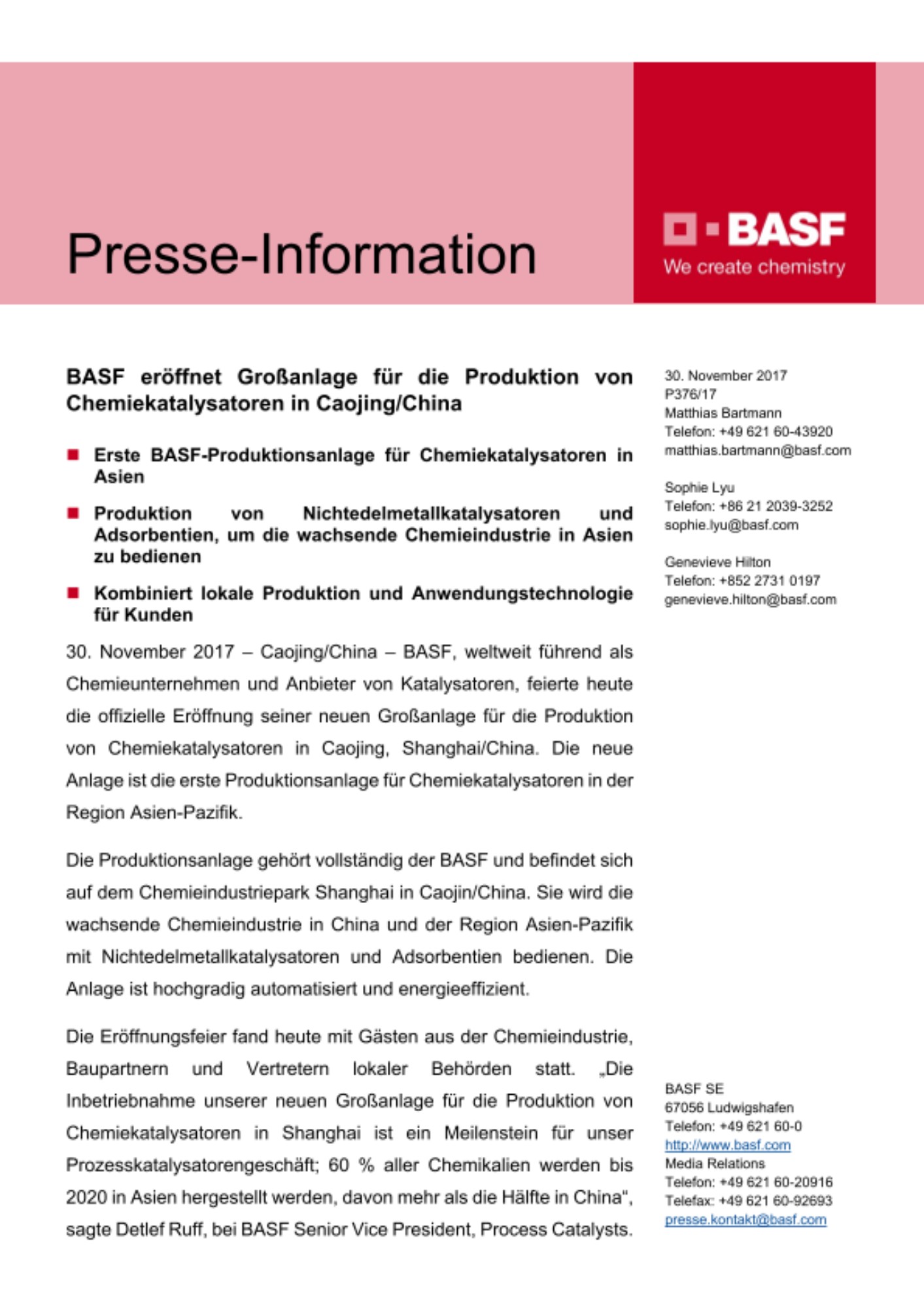 Die Eröffnungsfeier fand heute mit Gästen aus der Chemieindustrie, Baupartnern und Vertretern lokaler Behörden statt. „Die Inbetriebnahme unserer neuen Großanlage für die Produktion von Chemiekatalysatoren in Shanghai ist ein Meilenstein für unser Prozesskatalysatorengeschäft; 60 % aller Chemikalien werden bis 2020 in Asien hergestellt werden, davon mehr als die Hälfte in China“, sagte Detlef Ruff, bei BASF Senior Vice President, Process Catalysts. „Die lokale Fertigung wird uns wesentlich dabei helfen, unsere Kundenbeziehungen in der Chemieindustrie in Asien zu stärken und durch erhöhte Produktverfügbarkeit und verkürzte Durchlaufzeiten zu verbessern. In Kombination mit dem BASF Innovation Campus Asia Pacific in Shanghai können wir unseren Kunden nun eine regionalspezifische Entwicklung und Produktion der neuesten Katalysatortechnologien anbieten. Die Anlage bietet außerdem Potenzial für eine zusätzliche Erweiterung und die Flexibilität, sich in den nächsten Jahren an neue Produktionsanforderungen der Kunden anzupassen.“