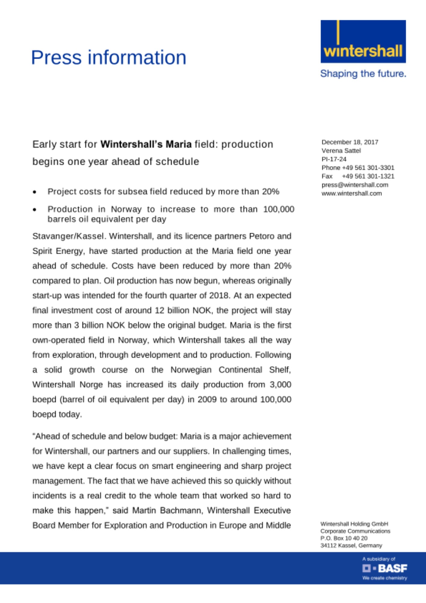 Stavanger/Kassel. Wintershall, and its licence partners Petoro and Spirit Energy, have started production at the Maria field one year ahead of schedule. Costs have been reduced by more than 20% compared to plan. Oil production has now begun, whereas originally start-up was intended for the fourth quarter of 2018. At an expected final investment cost of around 12 billion NOK, the project will stay more than 3 billion NOK below the original budget. Maria is the first own-operated field in Norway, which Wintershall takes all the way from exploration, through development and to production. Following a solid growth course on the Norwegian Continental Shelf, Wintershall Norge has increased its daily production from 3,000 boepd (barrel of oil equivalent per day) in 2009 to around 100,000 boepd today.