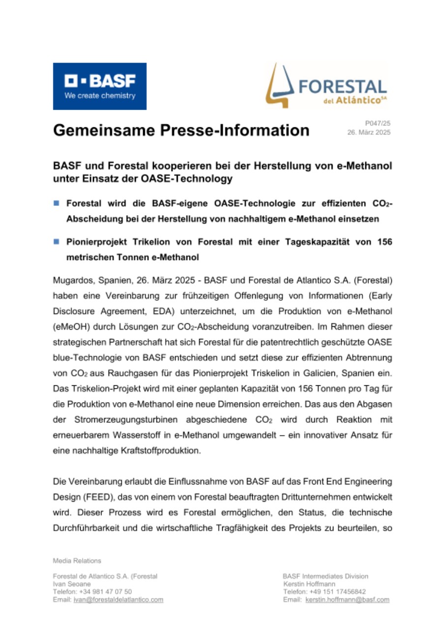 Mugardos, Spanien, 26. März 2025 - BASF und Forestal de Atlantico S.A. (Forestal) haben eine Vereinbarung zur frühzeitigen Offenlegung von Informationen (Early Disclosure Agreement, EDA) unterzeichnet, um die Produktion von e-Methanol (eMeOH) durch Lösungen zur CO2-Abscheidung voranzutreiben. Im Rahmen dieser strategischen Partnerschaft hat sich Forestal für die patentrechtlich geschützte OASE blue-Technologie von BASF entschieden und setzt diese zur effizienten Abtrennung von CO2 aus Rauchgasen für das Pionierprojekt Triskelion in Galicien, Spanien ein. Das Triskelion-Projekt wird mit einer geplanten Kapazität von 156 Tonnen pro Tag für die Produktion von e-Methanol eine neue Dimension erreichen. Das aus den Abgasen der Stromerzeugungsturbinen abgeschiedene CO2 wird durch Reaktion mit erneuerbarem Wasserstoff in e-Methanol umgewandelt – ein innovativer Ansatz für eine nachhaltige Kraftstoffproduktion.
