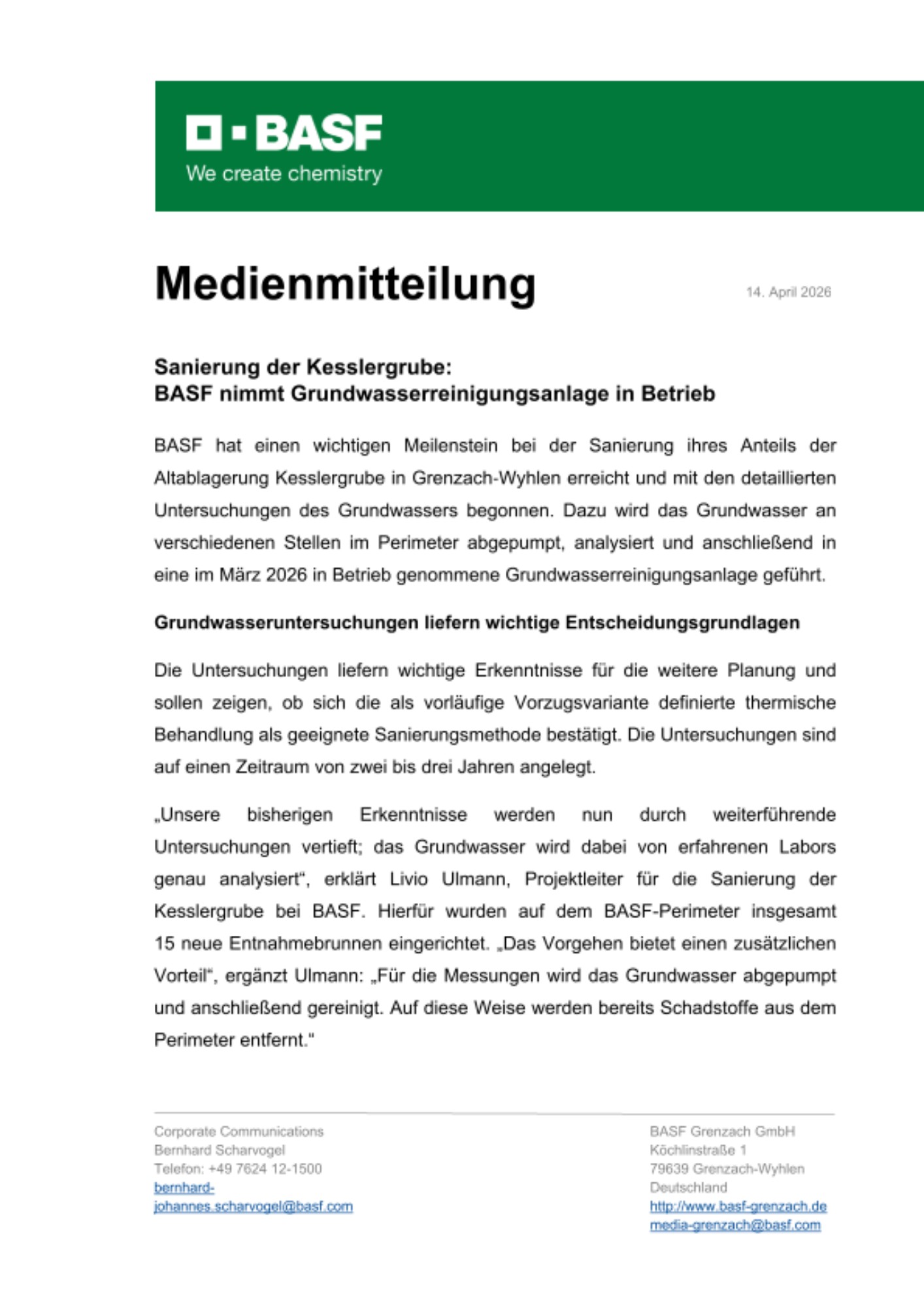 BASF hat einen wichtigen Meilenstein bei der Sanierung ihres Anteils der Altablagerung Kesslergrube in Grenzach‑Wyhlen erreicht und mit den detaillierten Untersuchungen des Grundwassers begonnen. Dazu wird das Grundwasser an verschiedenen Stellen im Perimeter abgepumpt, analysiert und anschließend in eine im März 2026 in Betrieb genommene Grundwasserreinigungsanlage geführt.