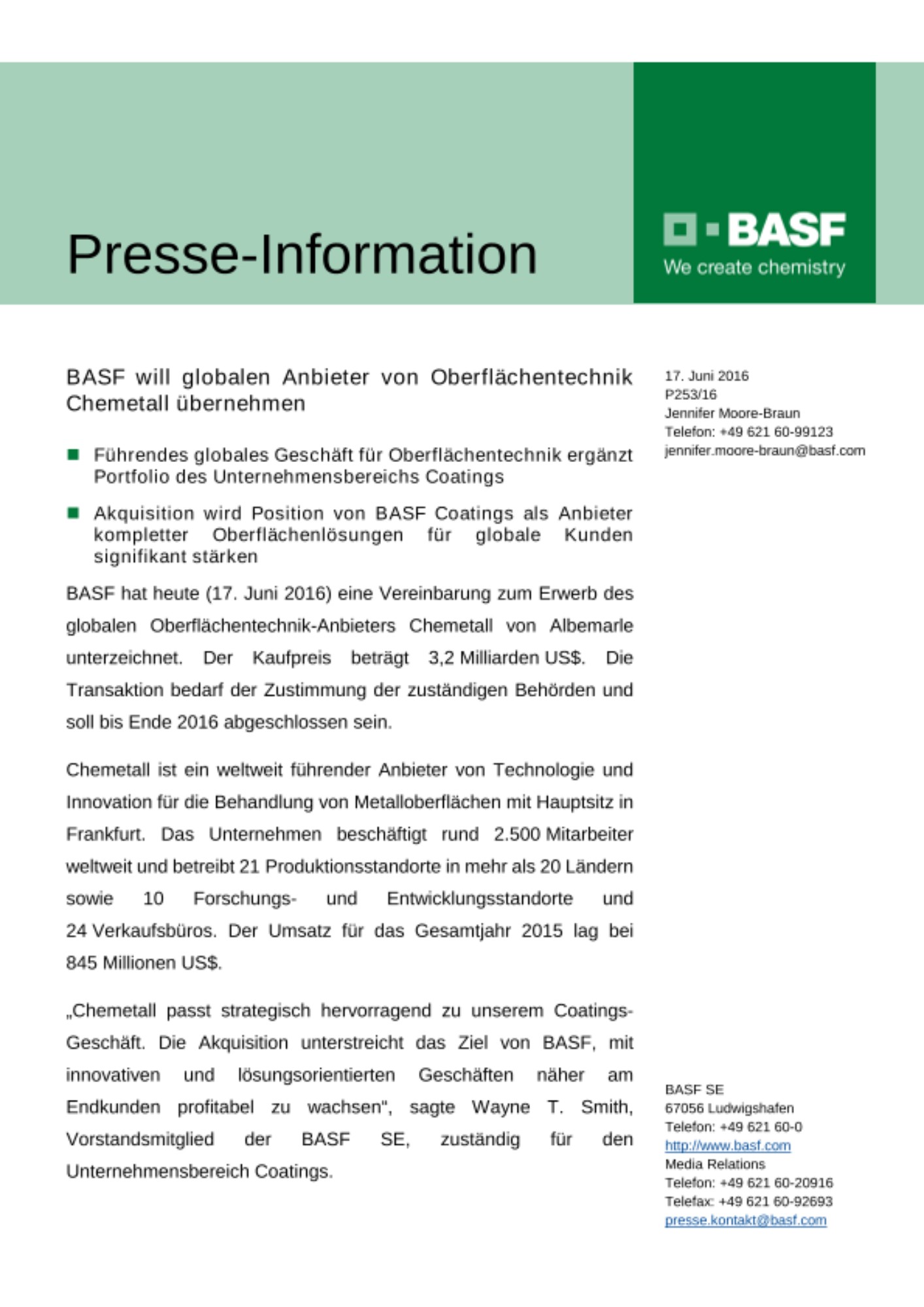 BASF hat am 17. Juni 2016 eine Vereinbarung zum Erwerb des globalen Oberflächentechnik-Anbieters Chemetall von Albemarle unterzeichnet. Der Kaufpreis beträgt 3,2 Milliarden US$. Die Transaktion bedarf der Zustimmung der zuständigen Behörden und soll bis Ende 2016 abgeschlossen sein.