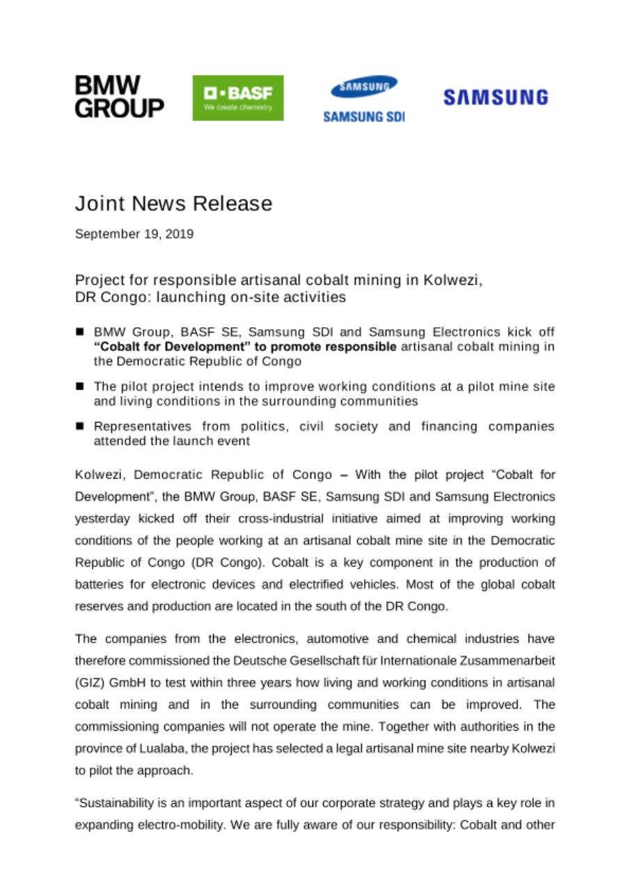 - BMW Group, BASF SE, Samsung SDI and Samsung Electronics kick off “Cobalt for Development” to promote responsible artisanal cobalt mining in the Democratic Republic of Congo