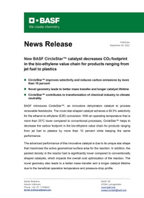 New BASF CircleStar™ catalyst decreases CO2 footprint in the bio-ethylene value chain for products ranging from jet fuel to plastics