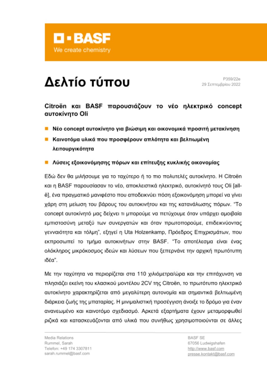 Η αυτοκινητοβιομηχανία Citroën συνεργάσθηκε στενά με την BASF κατά τη διάρκεια της ανάπτυξης και του σχεδιασμού. Καινοτόμες λύσεις από τη χημική βιομηχανία έπαιξαν σημαντικό ρόλο σε αυτήν την προσπάθεια συνδημιουργίας. “Η συνεργασία μας με τη Citroën για την ανάπτυξη του concept αυτοκινήτου ενισχύει την μετάβασή μας προς ένα πιο βιώσιμο μέλλον”, τόνισε η Uta Holzenkamp. “Η καινοτομία και η δημιουργικότητα είναι απαραίτητες για να συνδυαστούν ιδέες από διαφορετικές εταιρείες”. Η BASF ακολουθεί εδώ και χρόνια μια φιλόδοξη στρατηγική βιώσιμης ανάπτυξης. Ορισμένα από τα σημαντικότερα ορόσημα αυτής της στρατηγικής είναι το πρόγραμμα ChemCyclingTM για τη βελτίωση της χημικής ανακύκλωσης των πλαστικών, καθώς επίσης και το σύστημα ισοζυγίου βιομάζας, βάσει του οποίου οι ορυκτοί πόροι αντικαθίστανται στην παραγωγή από ανανεώσιμους πόρους.