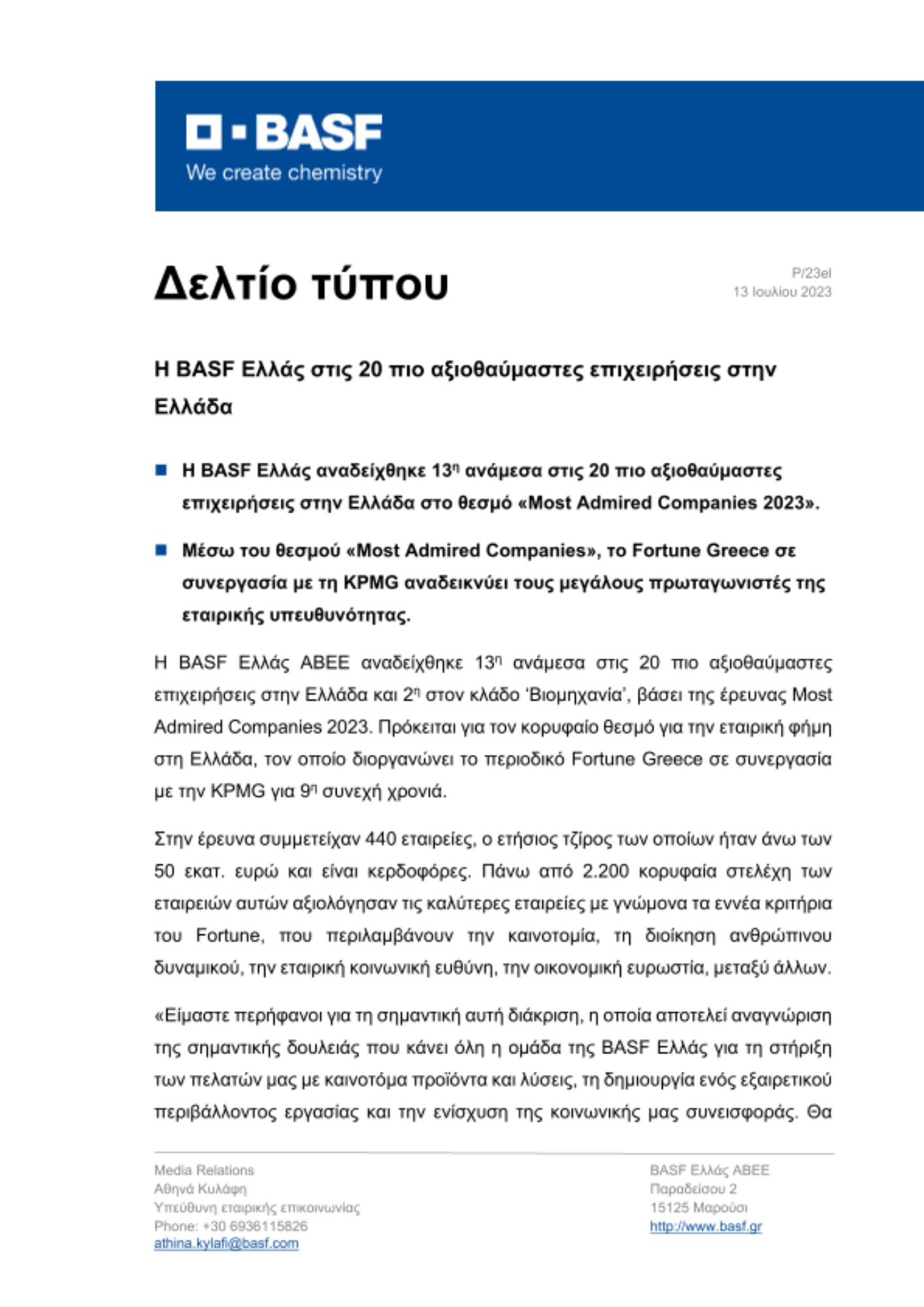 - Η BASF Ελλάς αναδείχθηκε 13η ανάμεσα στις 20 πιο αξιοθαύμαστες επιχειρήσεις στην Ελλάδα στο θεσμό «Most Admired Companies 2023».