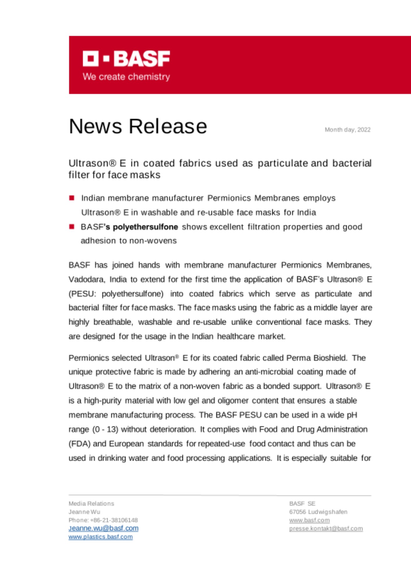 - Indian membrane manufacturer Permionics Membranes employs Ultrason® E in washable and re-usable face masks for India