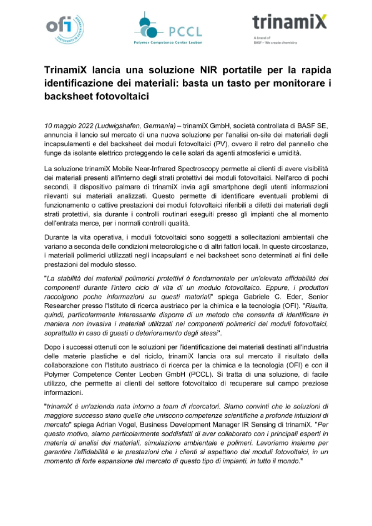 Dopo i successi ottenuti con le soluzioni per l'identificazione dei materiali destinati all'industria delle materie plastiche e del riciclo, trinamiX lancia ora sul mercato il risultato della collaborazione con l'Istituto austriaco di ricerca per la chimica e la tecnologia (OFI) e con il Polymer Competence Center Leoben GmbH (PCCL). Si tratta di una soluzione, di facile utilizzo, che permette ai clienti del settore fotovoltaico di recuperare sul campo preziose informazioni.