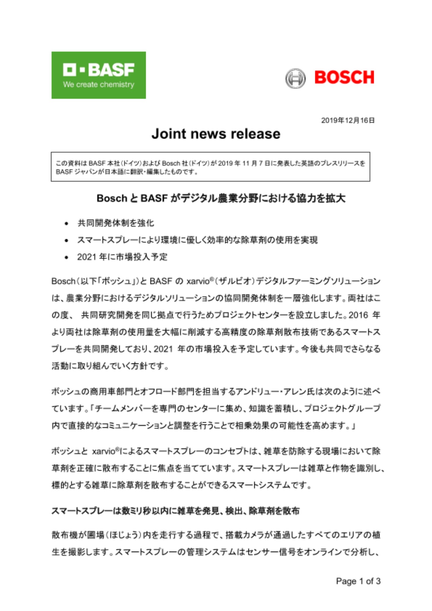 Bosch(以下「ボッシュ」)とBASFのxarvio®(ザルビオ)デジタルファーミングソリューションは、農業分野におけるデジタルソリューションの協同開発体制を一層強化します。両社はこの度、共同研究開発を同じ拠点で行うためプロジェクトセンターを設立しました。2016年より両社は除草剤の使用量を大幅に削減する高精度の除草剤散布技術であるスマートスプレーを共同開発しており、2021年の市場投入を予定しています。今後も共同でさらなる活動に取り組んでいく方針です。