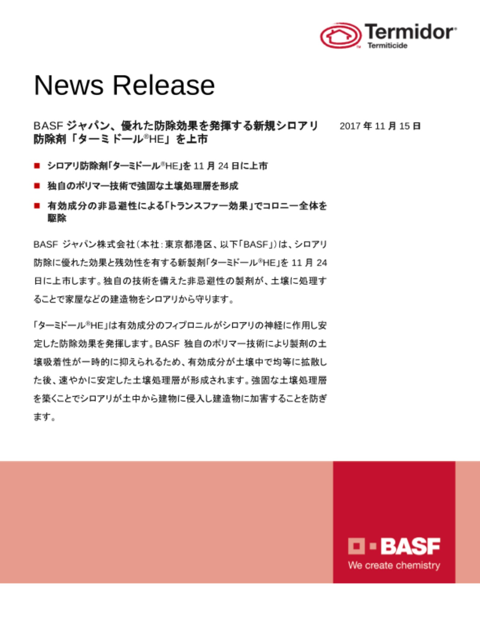 BASFジャパン株式会社(本社:東京都港区、以下「BASF」)は、シロアリ防除に優れた効果と残効性を有する新製剤「ターミドール®HE」を11月24日に上市します。独自の技術を備えた非忌避性の製剤が、土壌に処理することで家屋などの建造物をシロアリから守ります。
