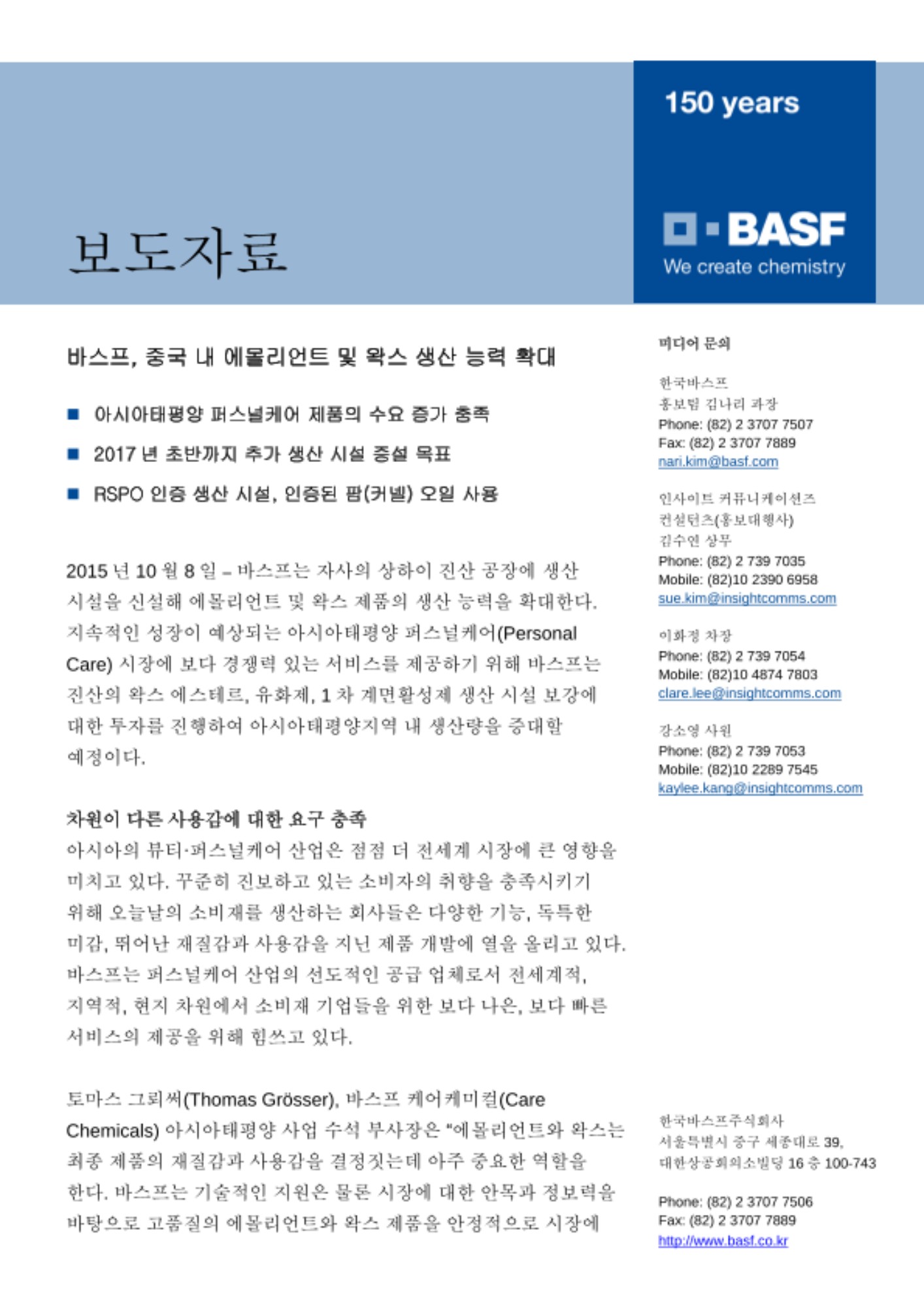 2015년 10월 8일 – 바스프는 자사의 상하이 진산 공장에 생산 시설을 신설해 에몰리언트 및 왁스 제품의 생산 능력을 확대한다. 지속적인 성장이 예상되는 아시아태평양 퍼스널케어(Personal Care) 시장에 보다 경쟁력 있는 서비스를 제공하기 위해 바스프는 진산의 왁스 에스테르, 유화제, 1차 계면활성제 생산 시설 보강에 대한 투자를 진행하여 아시아태평양지역 내 생산량을 증대할 예정이다.