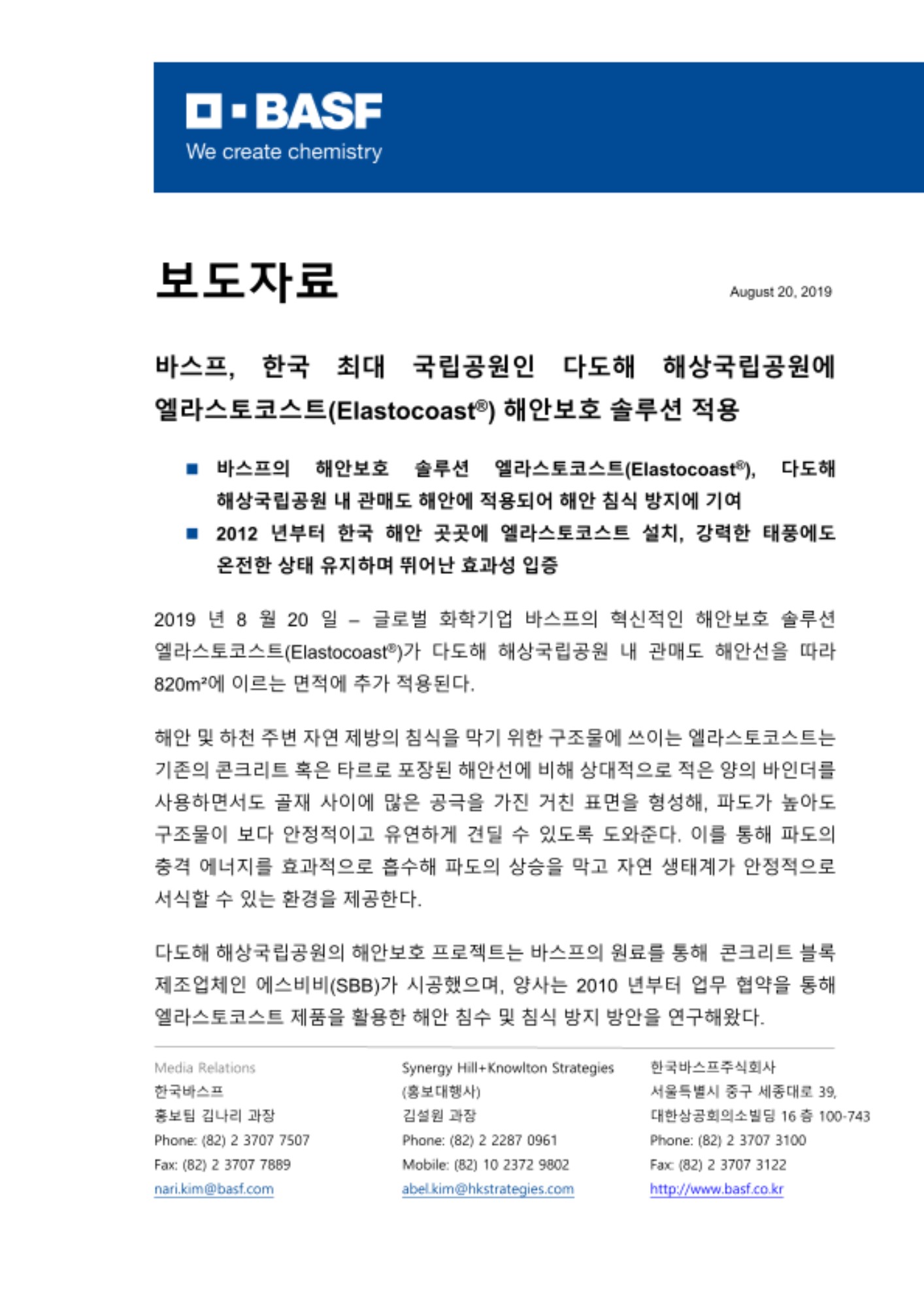 2019년 8월 20일 – 글로벌 화학기업 바스프의 혁신적인 해안보호 솔루션 엘라스토코스트(Elastocoast®)가 다도해 해상국립공원 내 관매도 해안선을 따라 820m²에 이르는 면적에 추가 적용된다.